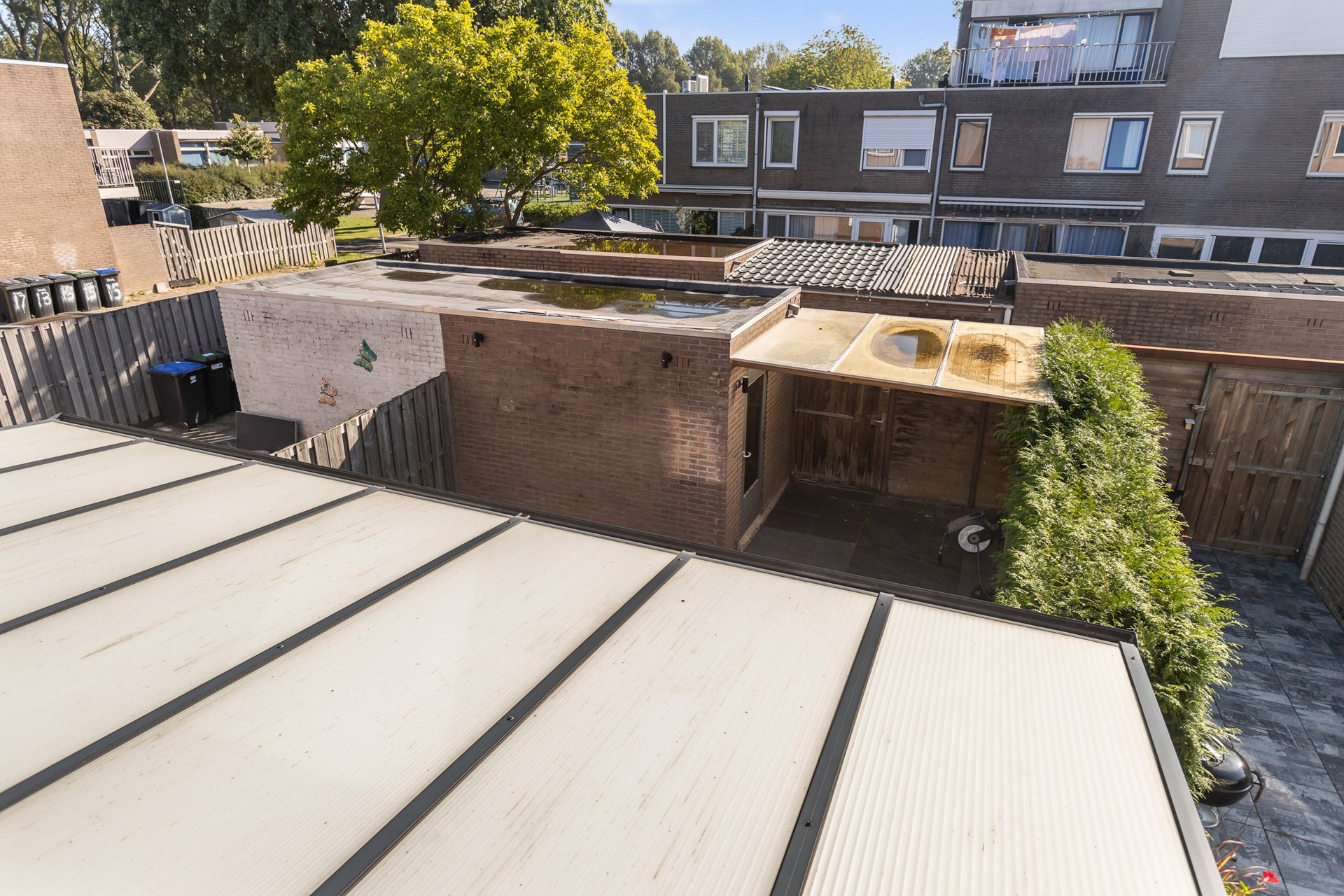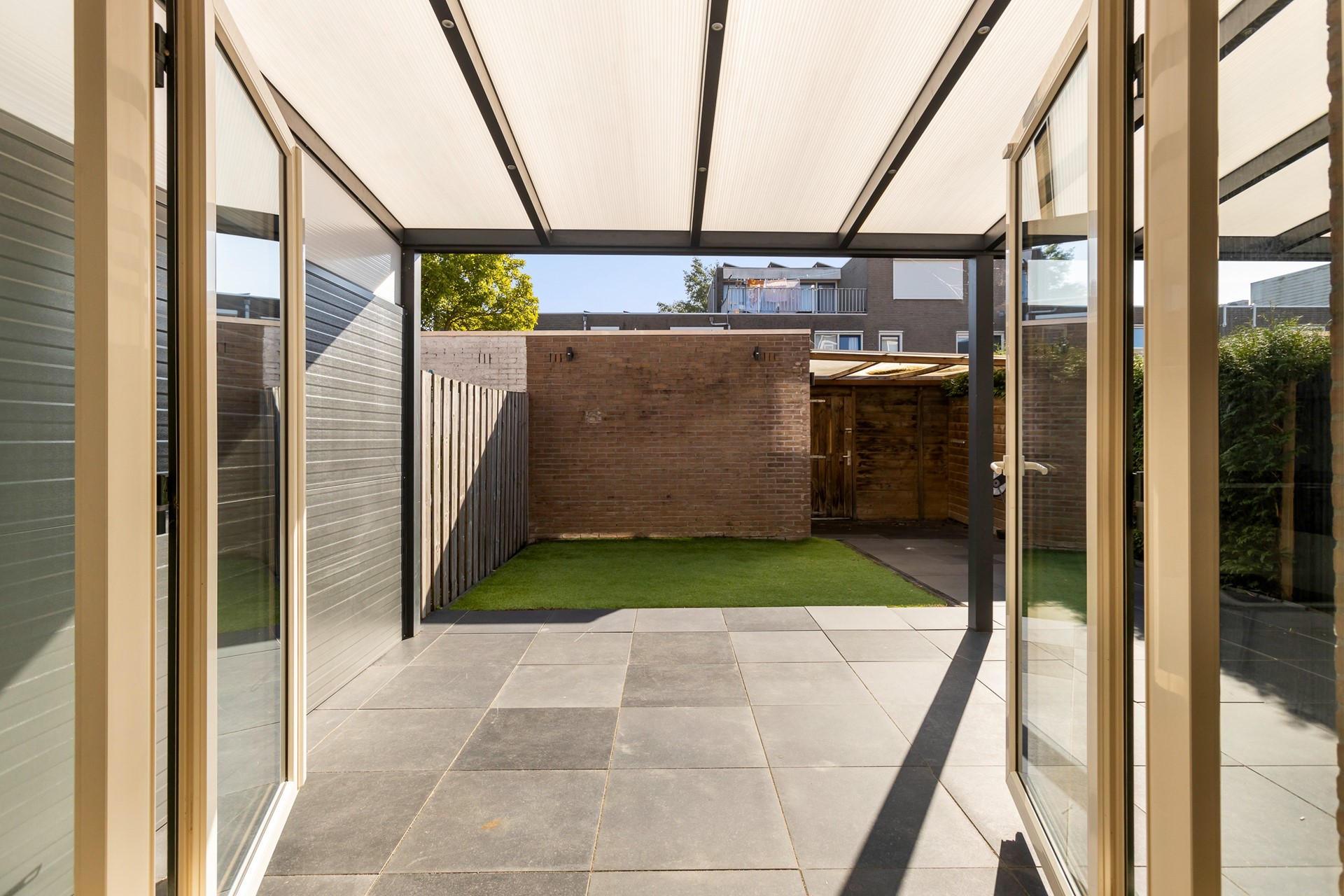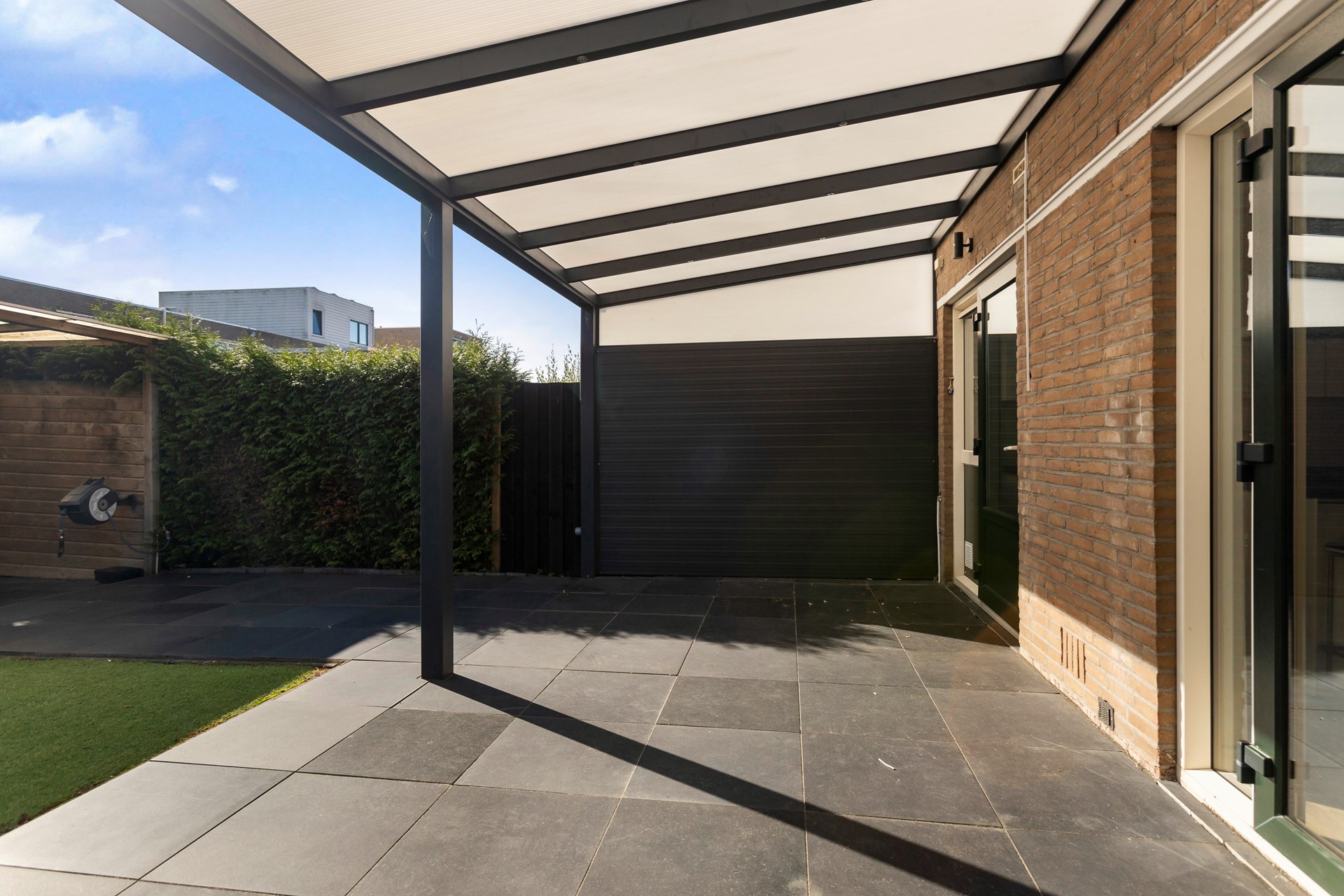 De woning beschikt over een lichte woonkamer met openslaande deuren naar de onderhoudsvriendelijke tuin met overkapping en ruime stenen berging. Of u nu wilt ontspannen in de avondzon of gezellig wilt barbecueën met familie en vrienden – hier kan het allemaal dankzij de heerlijke overkapping.