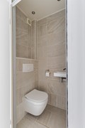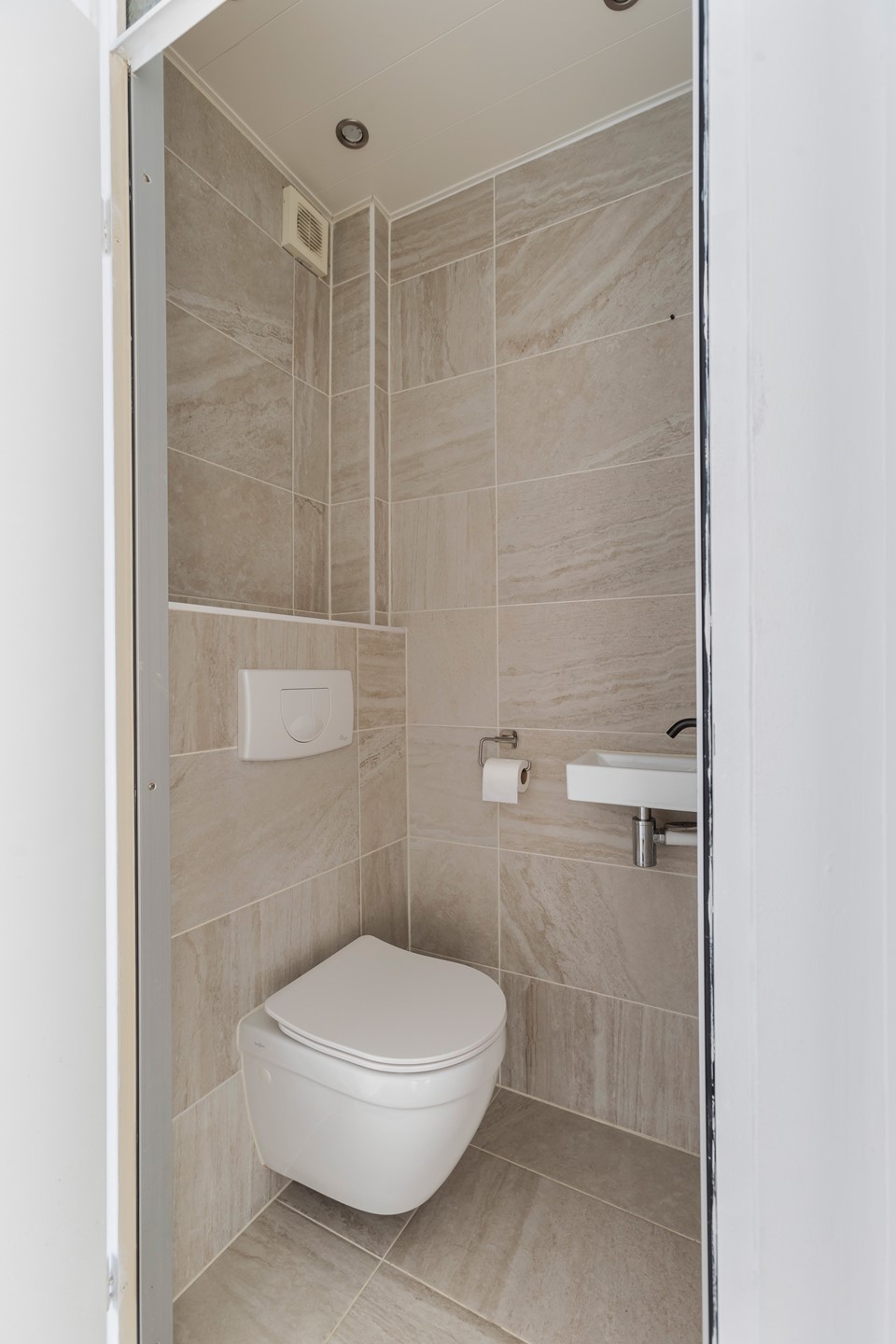 Volledig betegeld toilet met wandcloset en fonteintje en inbouwspotjes. Het toilet beschikt over mechanische ventilatie.