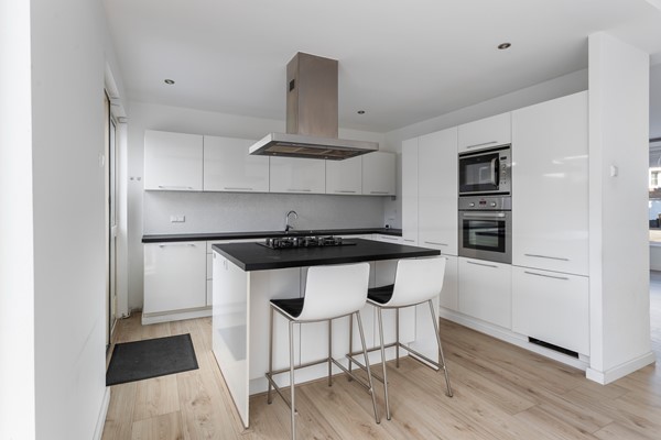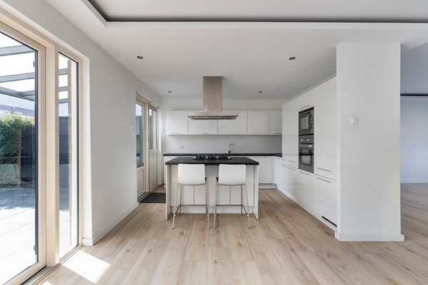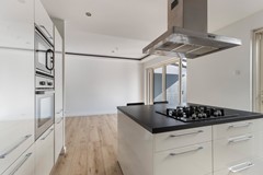 De open keuken is in hoek-opstelling met gezellig kookeiland en v.v. diverse inbouwapparatuur, waaronder: 4 pits gaskookplaat, afzuigsysteem, oven, combi-oven, 1,5 spoelbak, koelkast, vriezer, vaatwasser en veel laad en kastruimte.