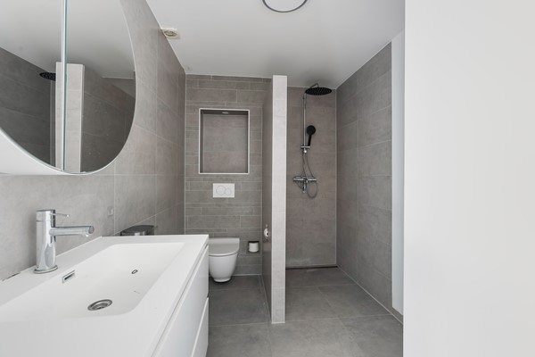 Volledig betegelde badkamer v.v. een inloopdouche, separate wandcloset met nisje, wastafel + meubel