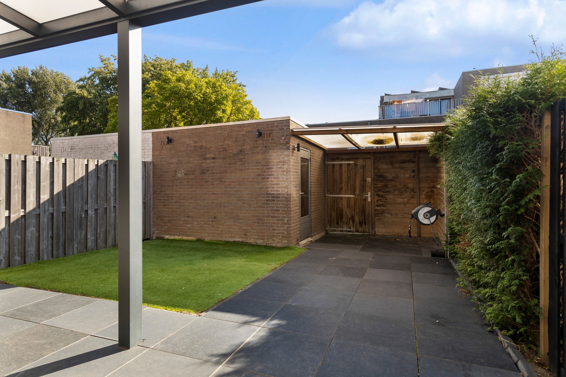 Riante op het oosten gelegen achtertuin met overkapping, buitenkraan, voorzien van keramische tegels, kunstgras, stenen berging en achterom.