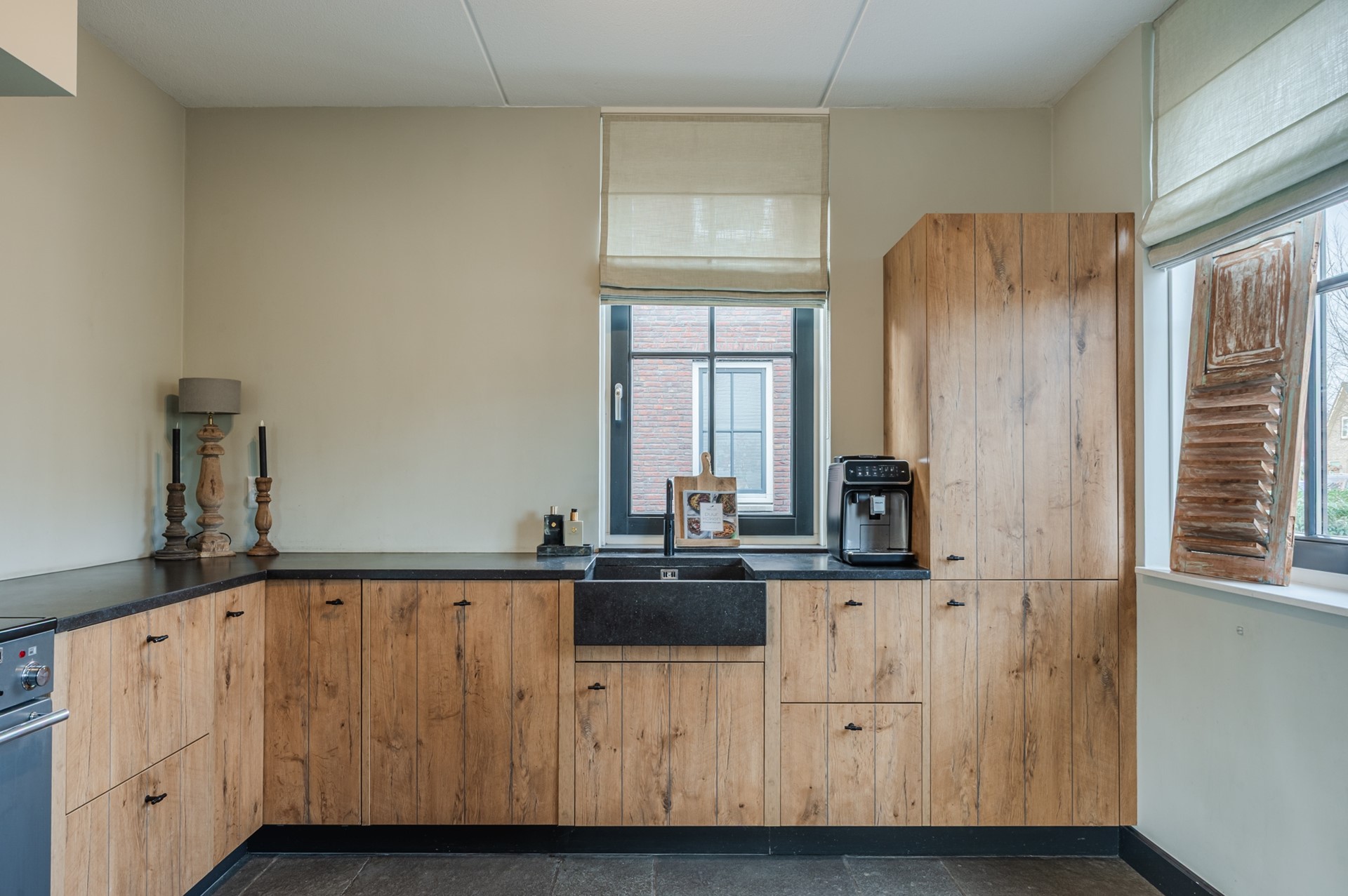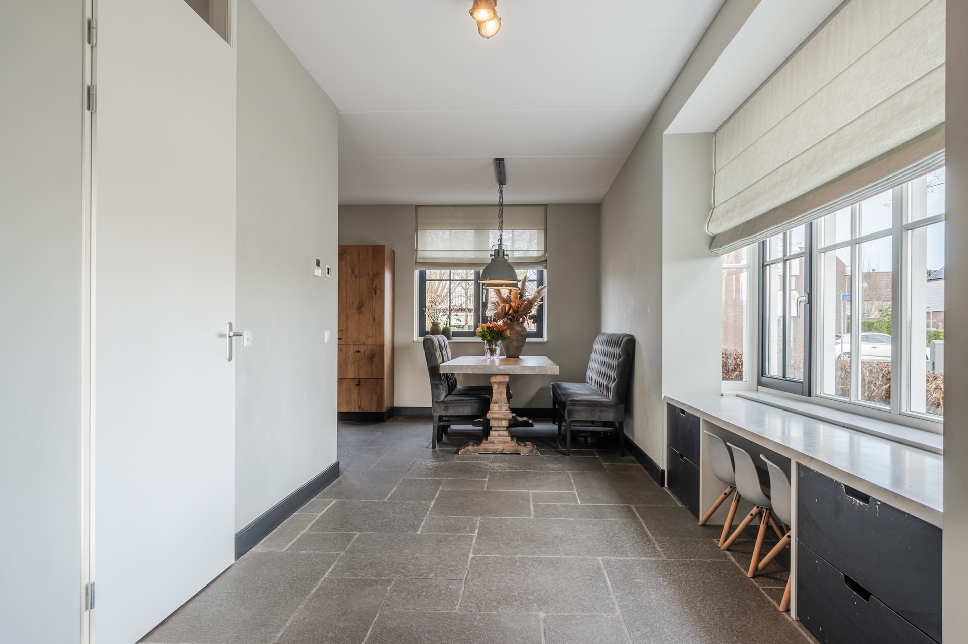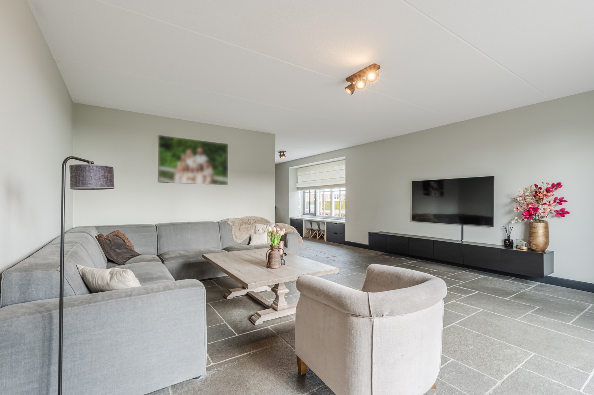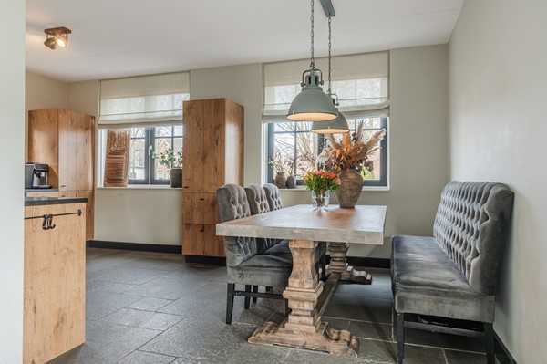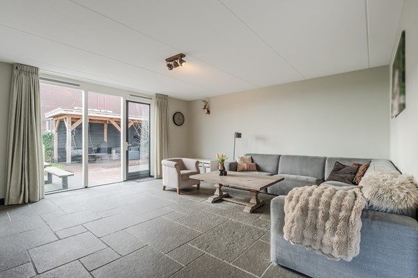 • Ruime, sfeervolle woonkamer met robuuste tegelvloer en mooie erker aan de zijkant, ideaal voor gezellige momenten
