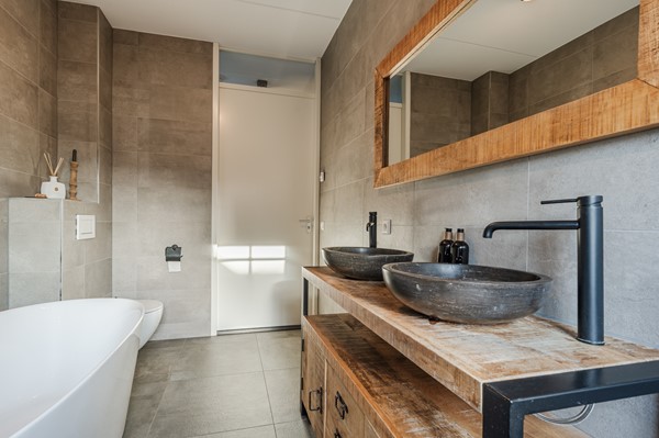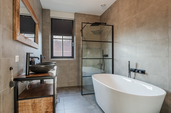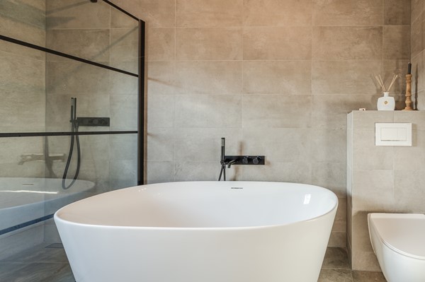 • Luxe familiebadkamer met ligbad én inloopdouche, dubbele wastafel en toilet – praktisch en stijlvol