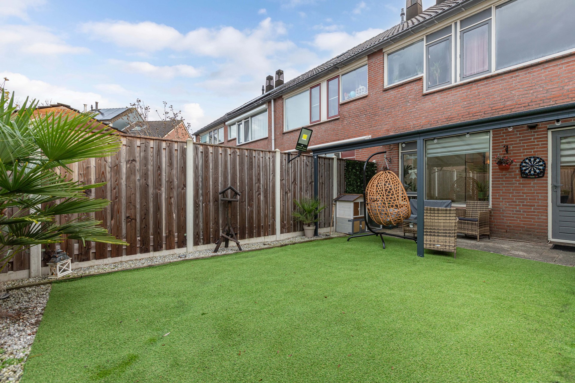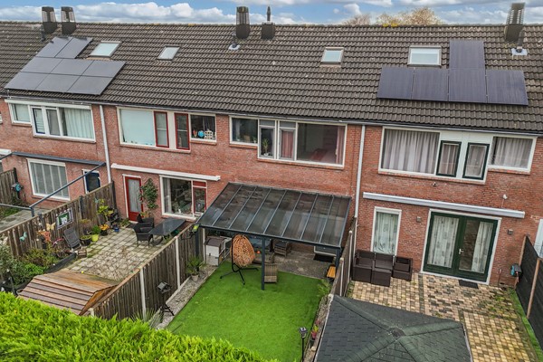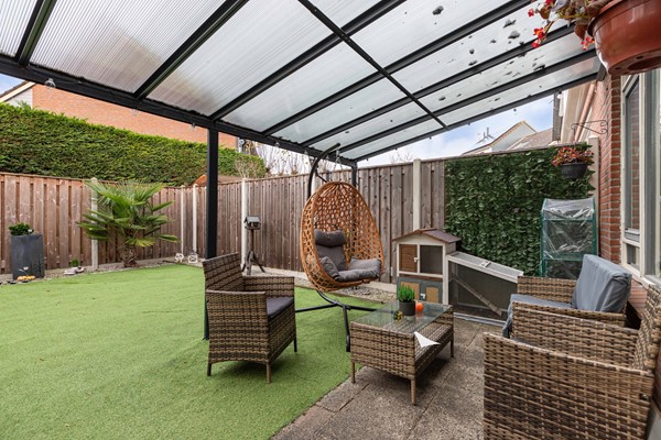 De achtertuin ligt op het westen, waardoor je hier tot in de avond van de zon kunt genieten. Dankzij de dit jaar nieuwgebouwede overkapping zit je ook bij minder weer comfortabel buiten. De nieuwe schutting (2023) geeft de tuin een strakke en frisse uitstraling. Aan de voorzijde bevinden zich de voortuin en een oprit met carport.