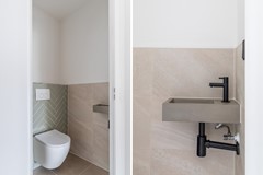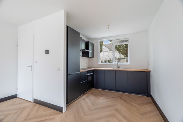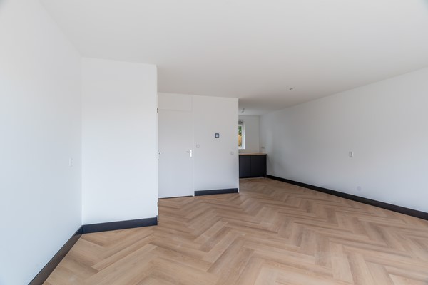Entree met hal, meterkast, vernieuwd toilet met fonteintje en trapopgang naar de eerste verdieping. De woonkamer is sfeervol en licht, met glad gestucte wanden en een moderne pvc-visgraatvloer die naadloos overloopt in de keuken. De keuken in L-opstelling (2025) bevindt zich aan de voorzijde en is uitgerust met diverse inbouwapparatuur: koel-vriescombinatie met oven, inductiekookplaat, afzuigkap, vaatwasser en spoelbak. Via de loopdeur in de woonkamer stap je de zonnige achtertuin in.