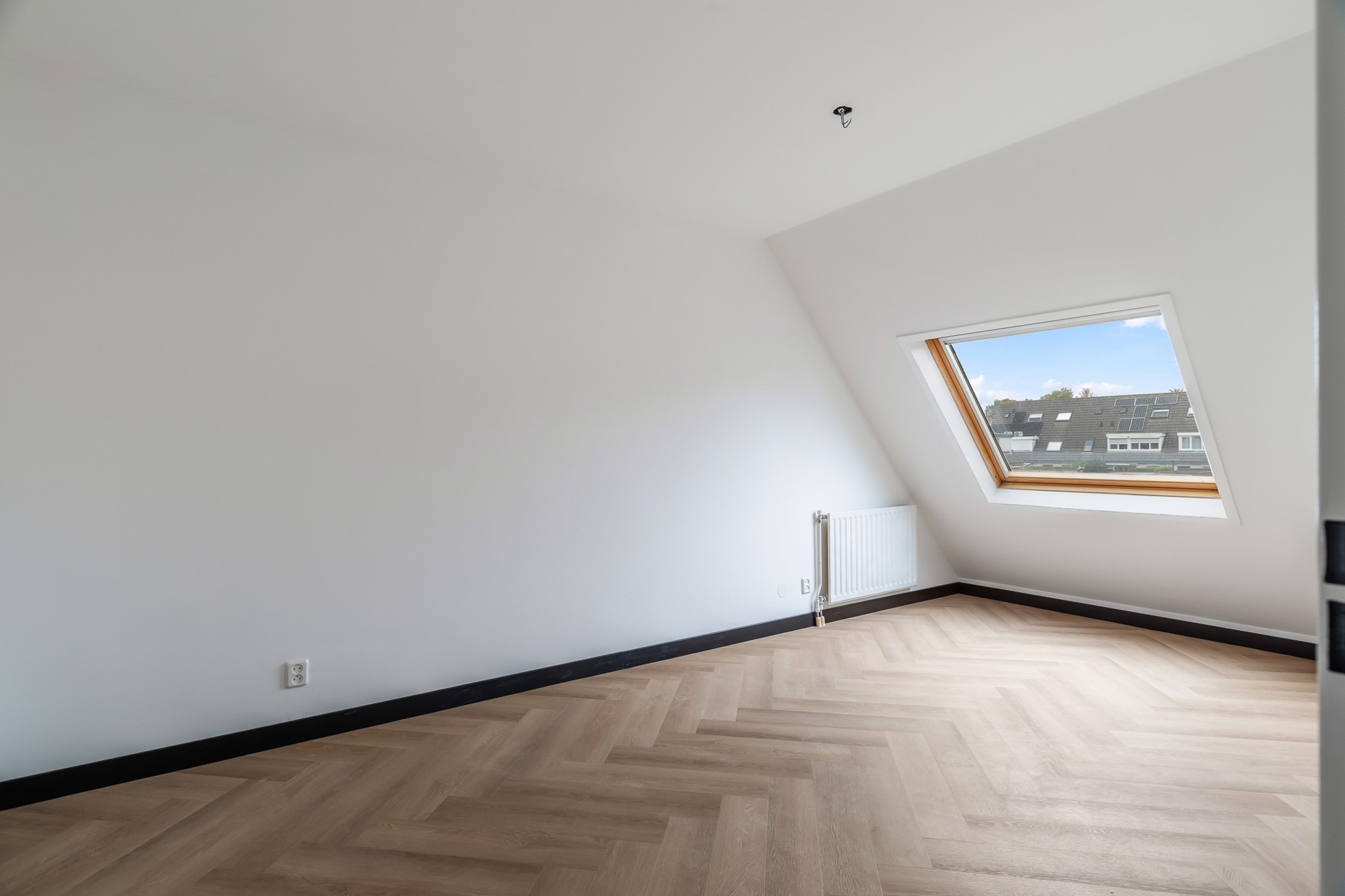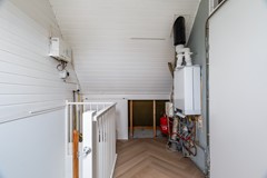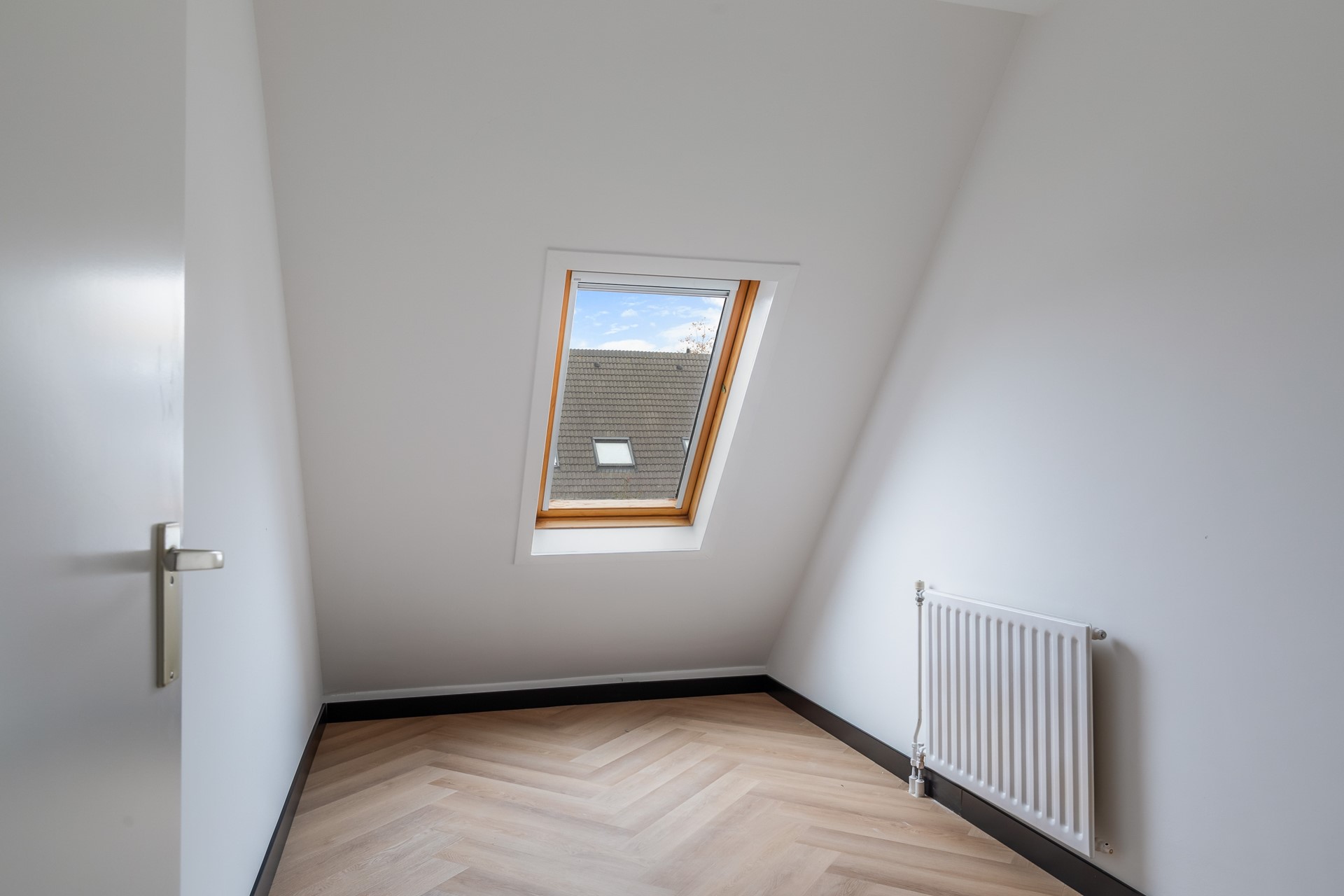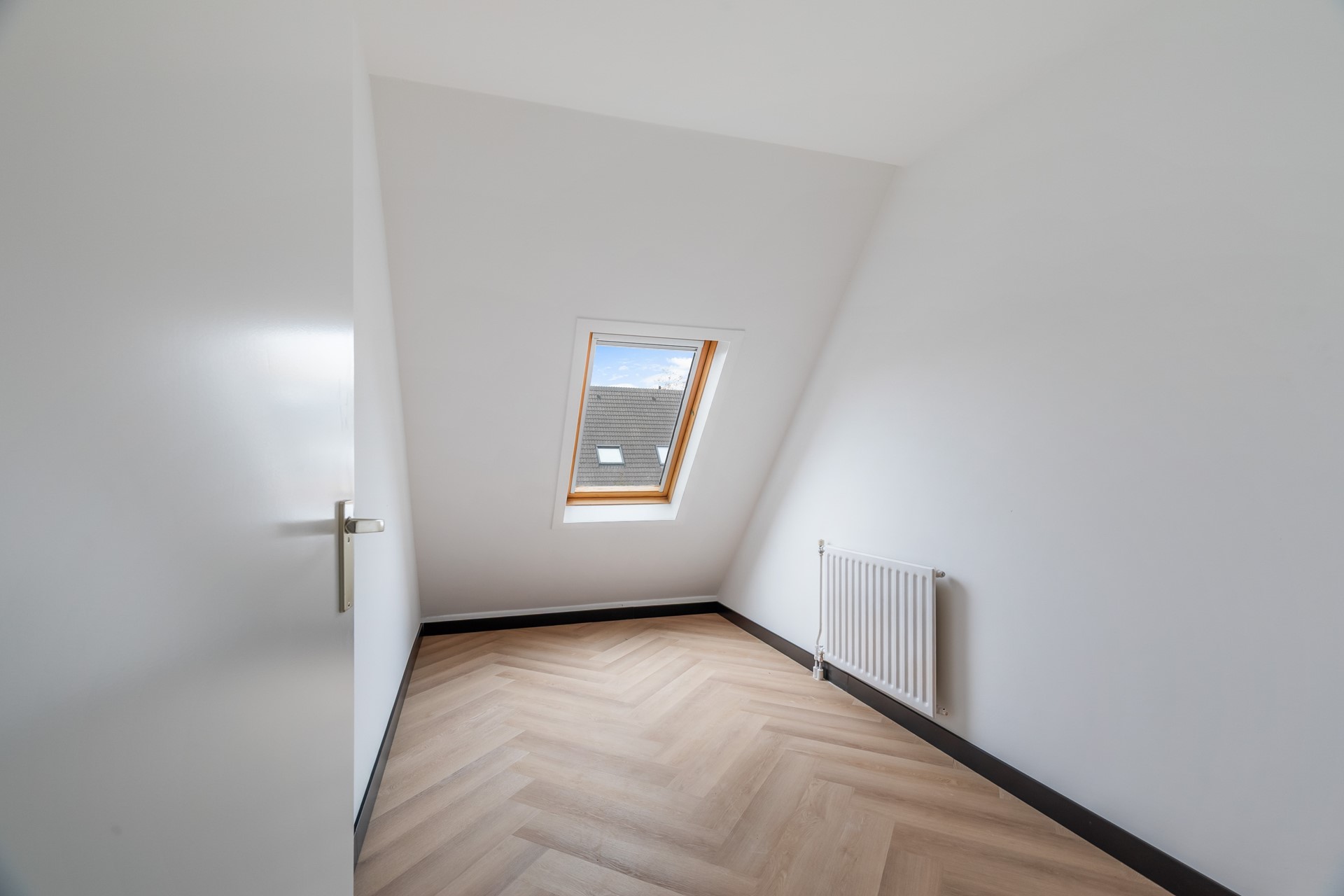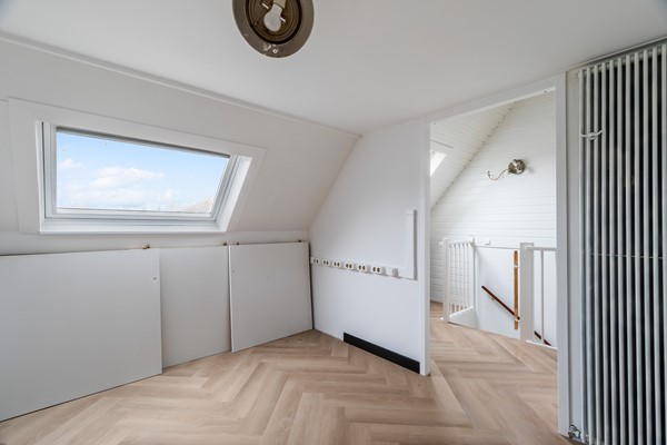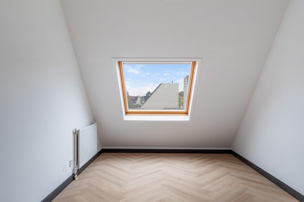 Vaste trap naar de voorzolder met aansluitingen voor wasmachine en droger, en opstelling van de cv-ketel (Intergas, 2025). Aansluitend een ruime vierde slaapkamer met dakraam, eveneens met pvc-vloer en gestucte wanden – een fijne werk- of logeerkamer.