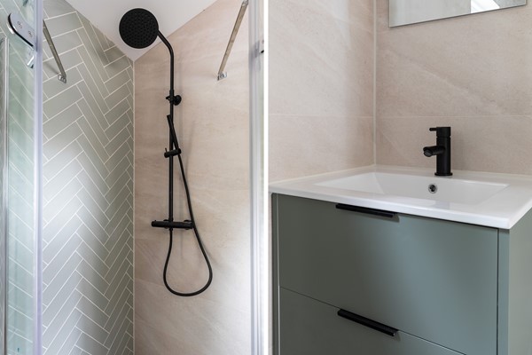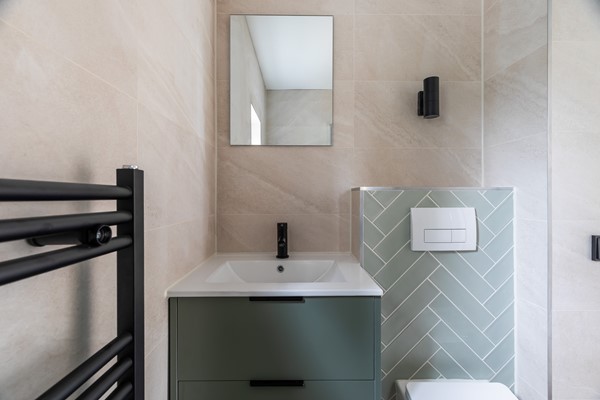Overloop met toegang tot drie slaapkamers en de recent vernieuwde badkamer (2025), uitgevoerd in moderne stijl met douche, wastafelmeubel en tweede toilet. Ook op deze verdieping zijn de vloeren voorzien van pvc-visgraat en de wanden strak gestuct. Aan de achterzijde ligt de grootste slaapkamer met daarnaast de derde slaapkamer. De badkamer en tweede slaapkamer liggen aan de voorzijde.
