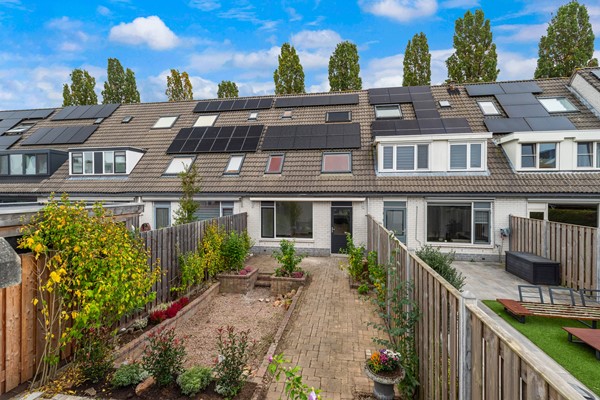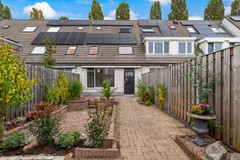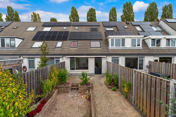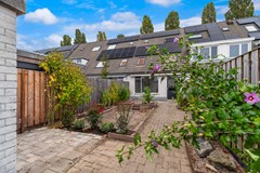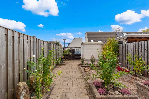 De achtertuin ligt op het westen en biedt volop zon tot in de avond. De tuin is eenvoudig aangelegd met terras en borders, en achterin bevindt zich een vrijstaande berging met elektra. Via de achterom is de tuin gemakkelijk bereikbaar. Door de ligging van de achtertuin is er veel privacy en kijk je aan de achterzijde niet direct tegen andere woningen aan.