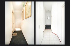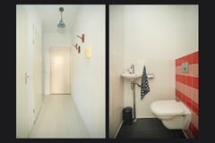 Op de eerste verdieping ligt de entree van de woning. Vanuit de hal zijn de woonkamer en keuken en het toilet bereikbaar.