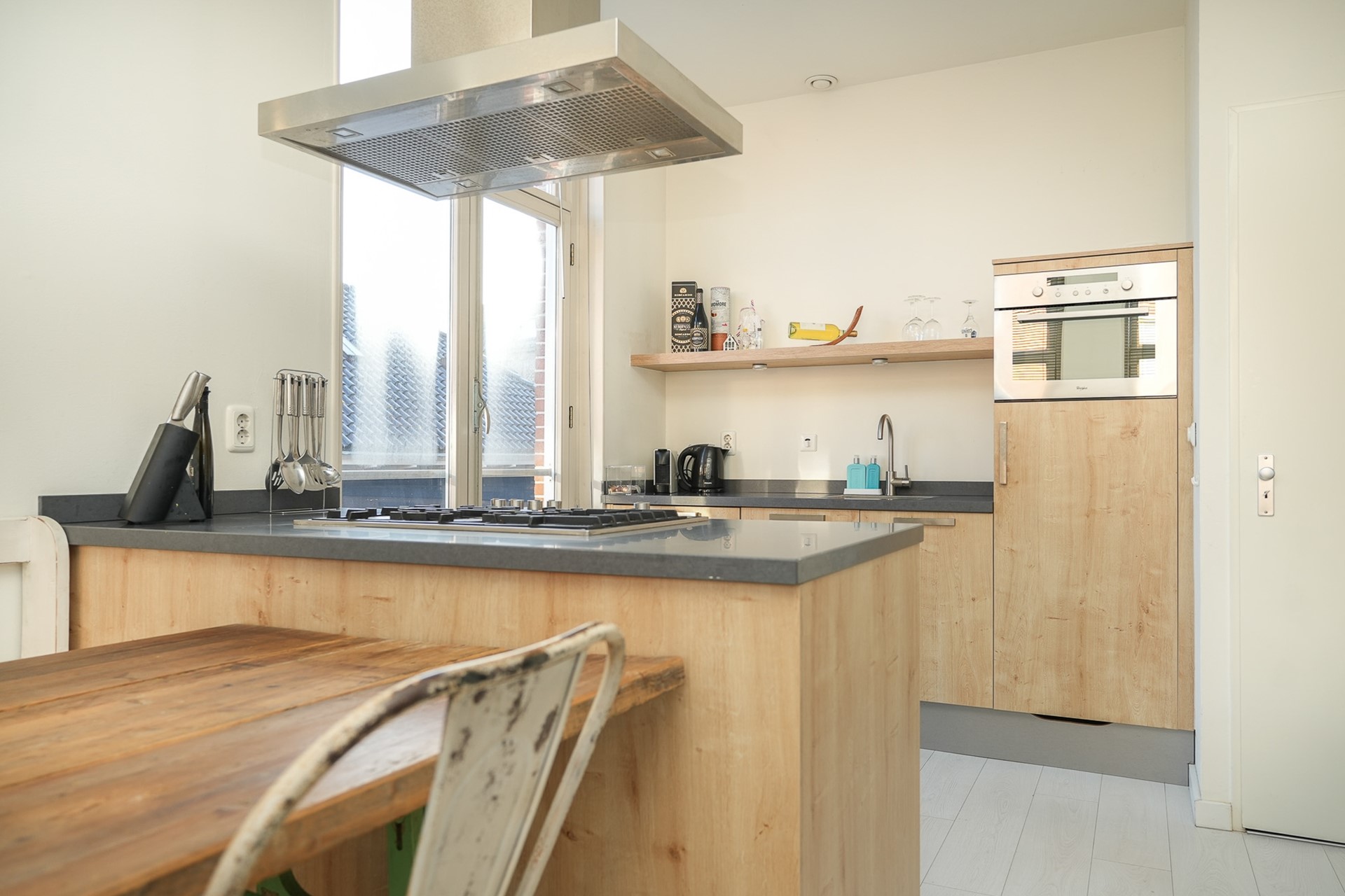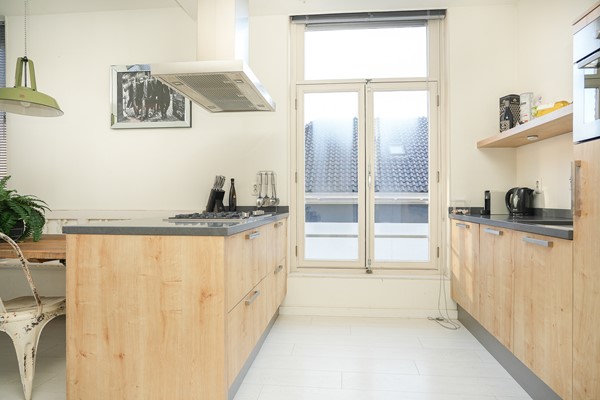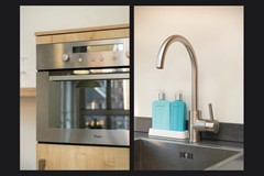 De keuken in eikenhoutenlook sluit aan op de woonkamer en is praktisch ingericht. De keuken is uitgerust met een vaatwasser, combi-oven/magnetron en koelkast. Op het schiereiland ligt een 5 pits gaskookplaat. Door de open verbinding blijft er een fijne samenhang tussen koken en wonen. Perfect voor de gezellige dineravonden.