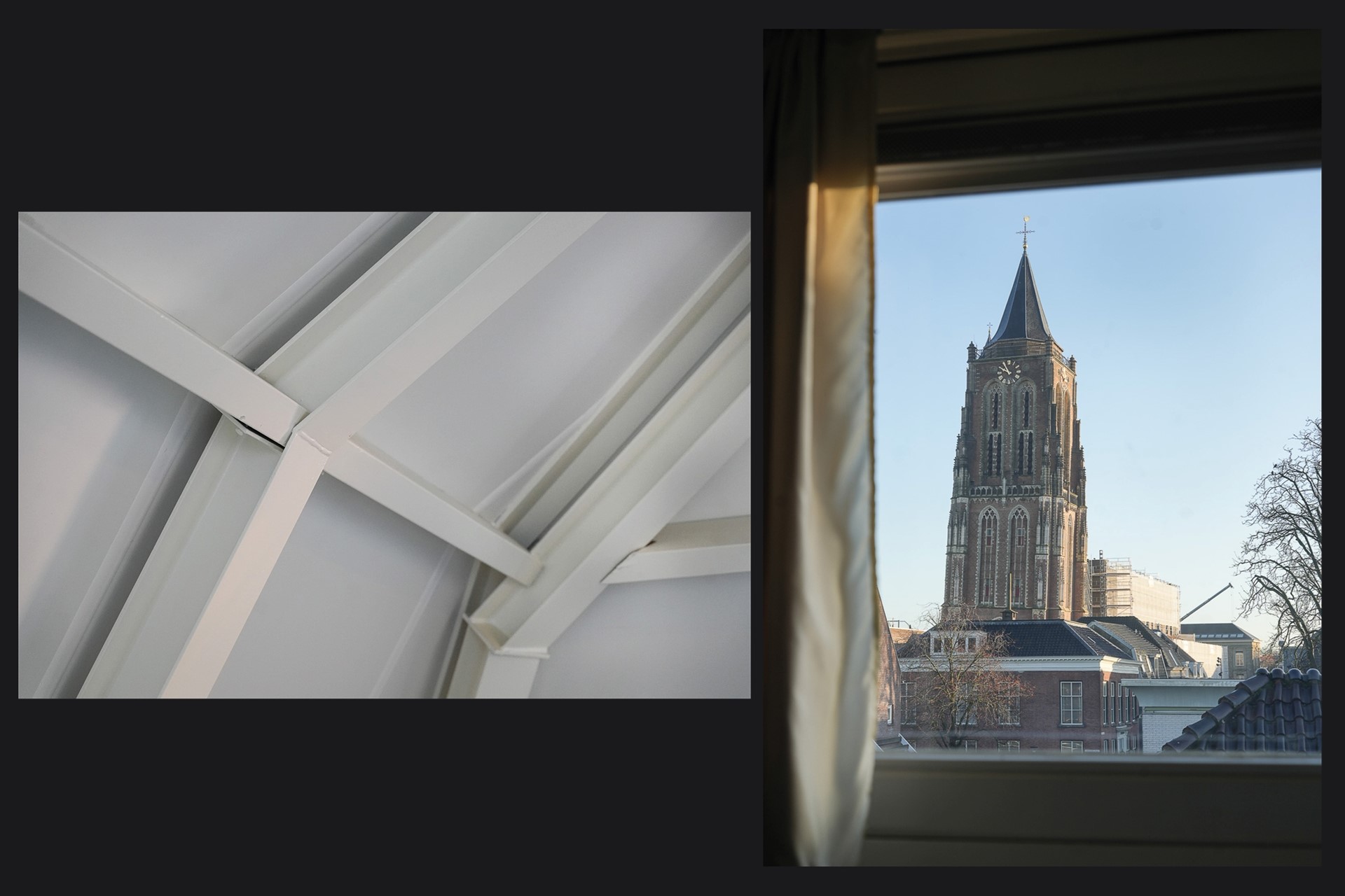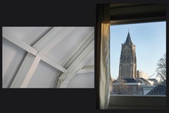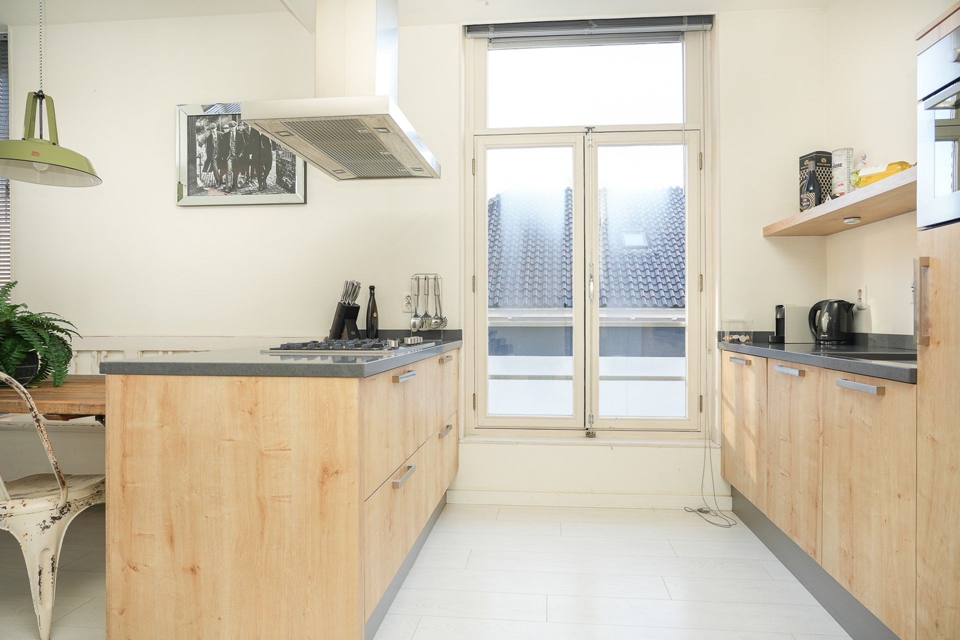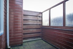 Vanaf deze verdieping is ook het balkon bereikbaar. Een beschutte buitenruimte waar je prettig buiten kunt zitten, met uitzicht over de stad.