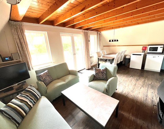 De woonkamer heeft vrij uitzicht over een ruim grasveld en een leuke zit- en eethoek met modern interieur. De gerenoveerde open keuken is voorzien van o.a. een koelkast met vriesvak, inductiekookplaat, vaatwasser en losse combimagnetron.