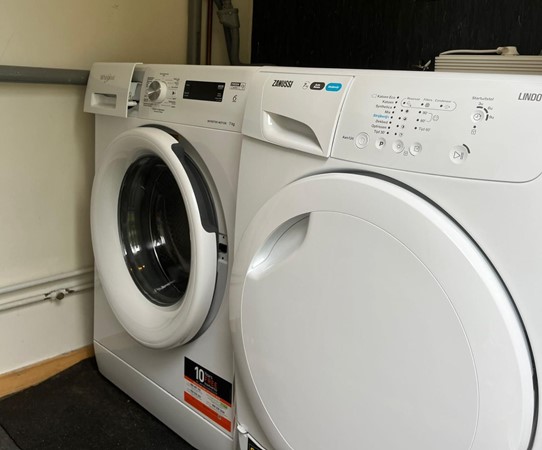 De berging met wasmachine en droger aansluiting en de boiler en daarnaast de meterkast zijn buitenom bereikbaar.