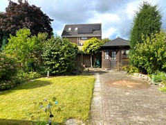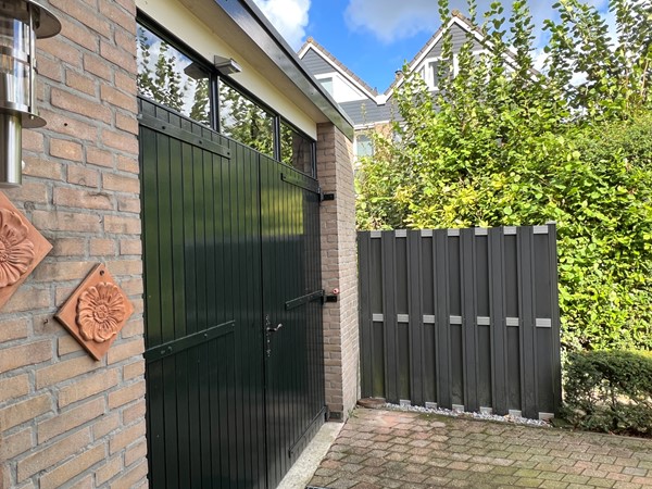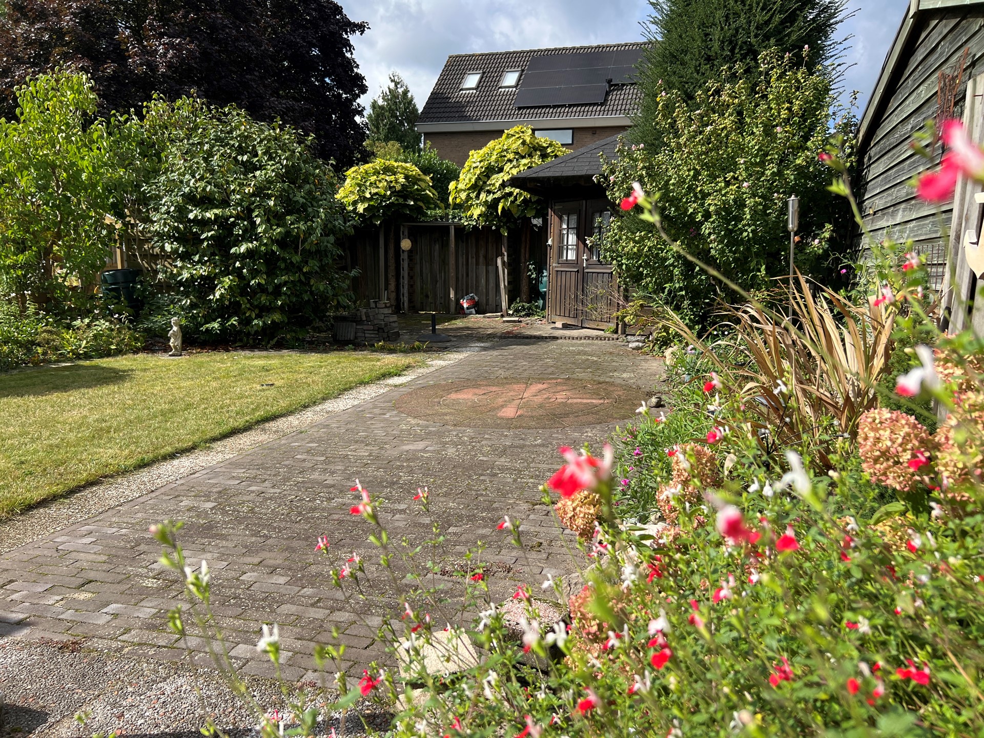 Diepe voor- en tevens een diepe achtertuin. Royale oprit geschikt voor meerdere auto's. Garage bereikbaar vanuit zowel de voor- als de achtertuin. Aparte houten berging in de achtertuin, deze is zonnig gelegen op het zuidwesten.