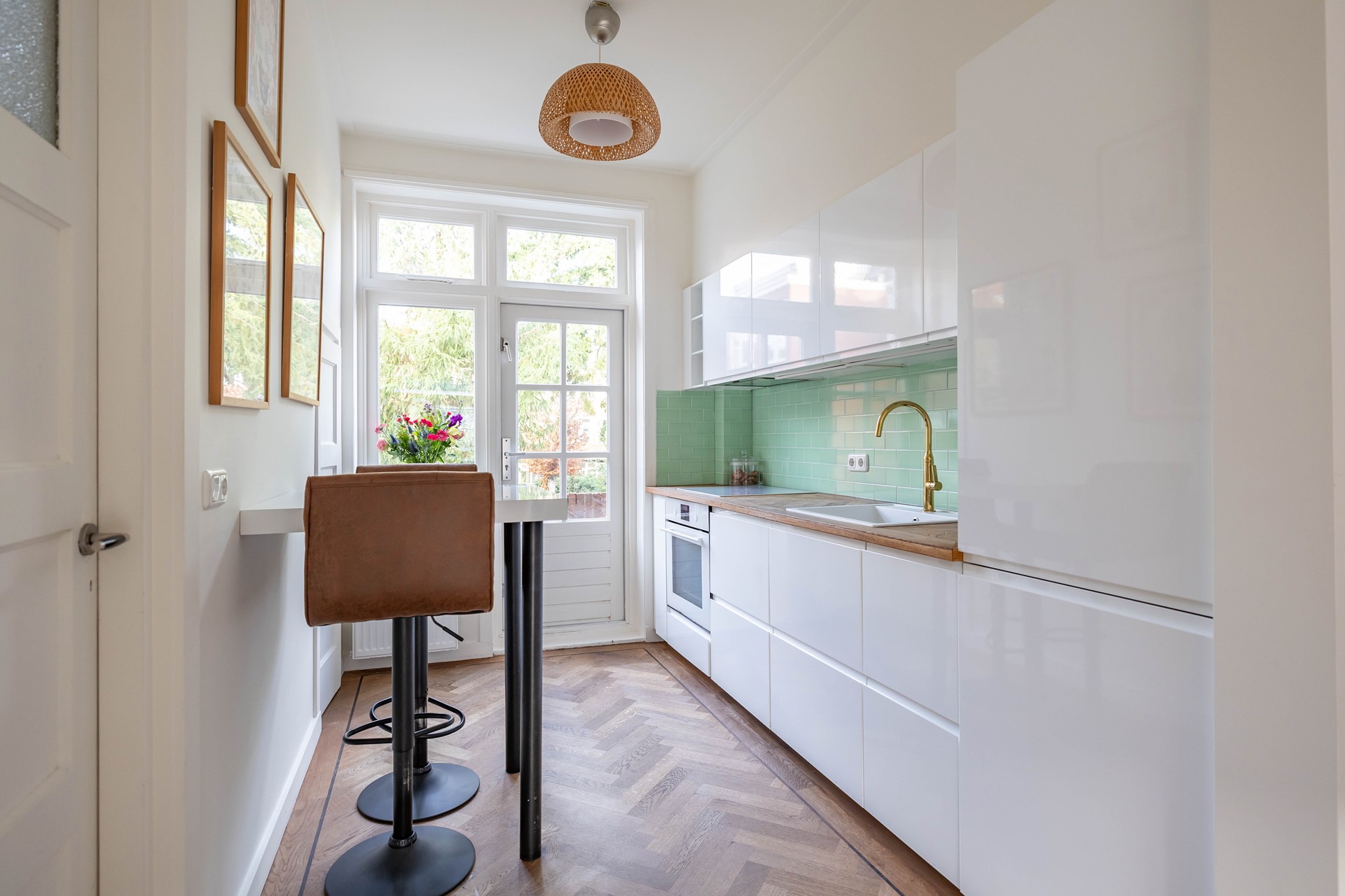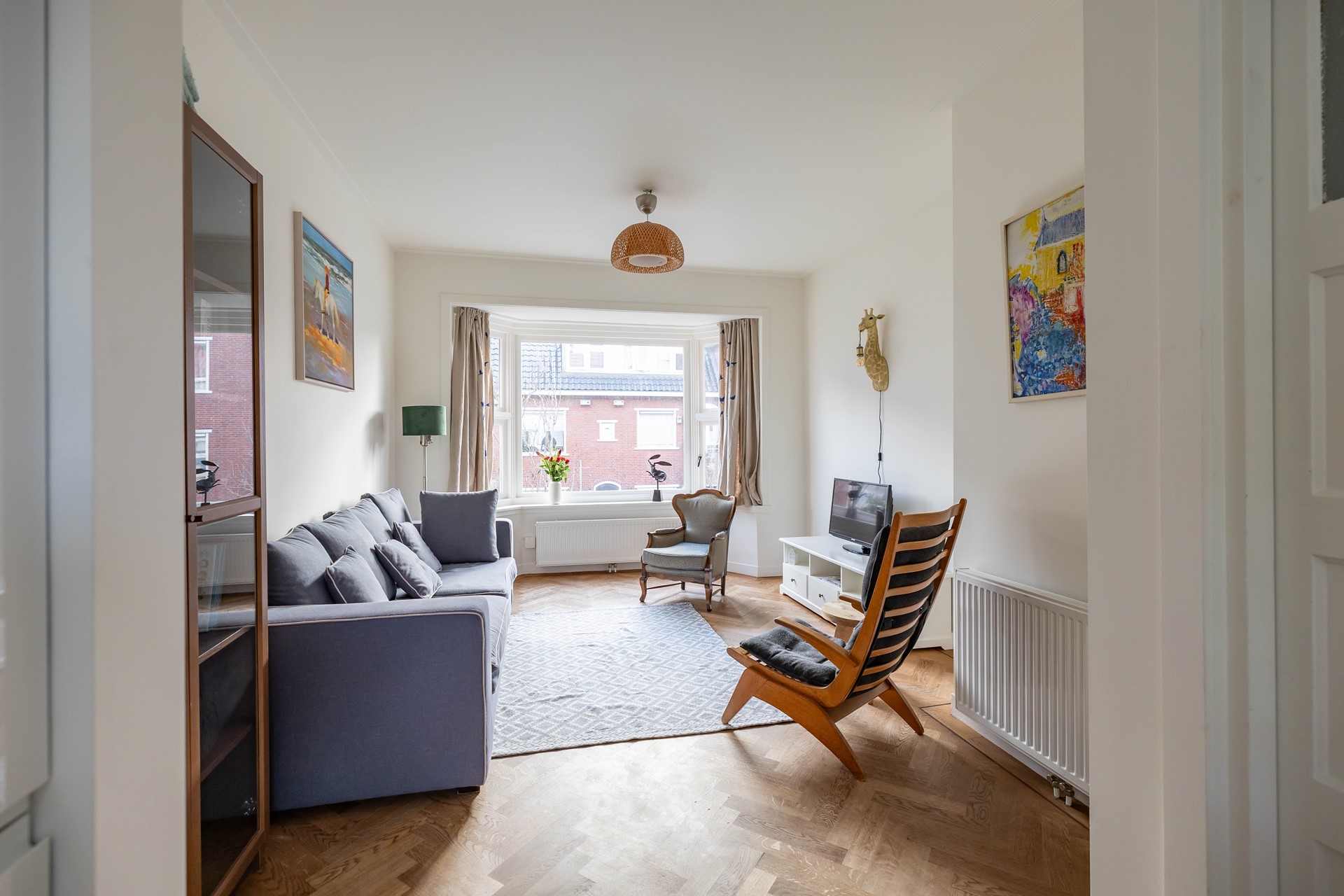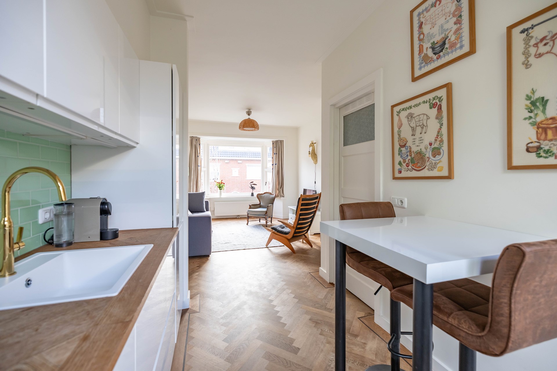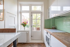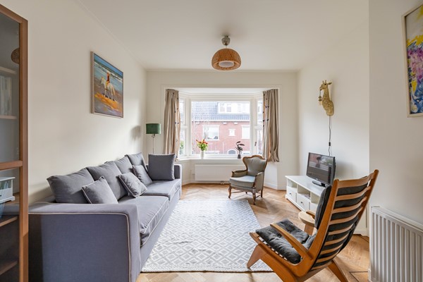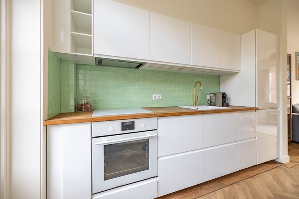 Stap binnen in de woonkamer met sfeervolle erker, waar door de grote raampartijen volop licht naar binnen valt. De warme houten parketvloer en het nette stucwerk geven direct een strak en eigentijds gevoel. De moderne open keuken is voorzien van inbouwapparatuur. En vanuit de keuken loop je zo het balkon op: een fijne plek om ’s ochtends te genieten van je koffie of ’s avonds de dag af te sluiten.