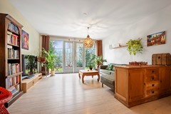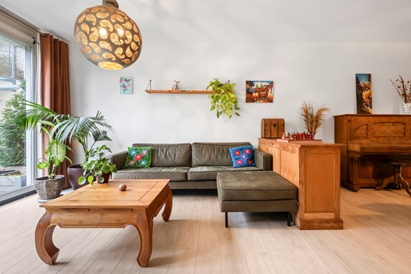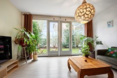 Via de openslaande deuren loop je zo de beschutte, gezamenlijke binnentuin in – een fijne plek om buiten te zitten en te ontspannen.