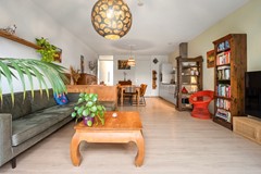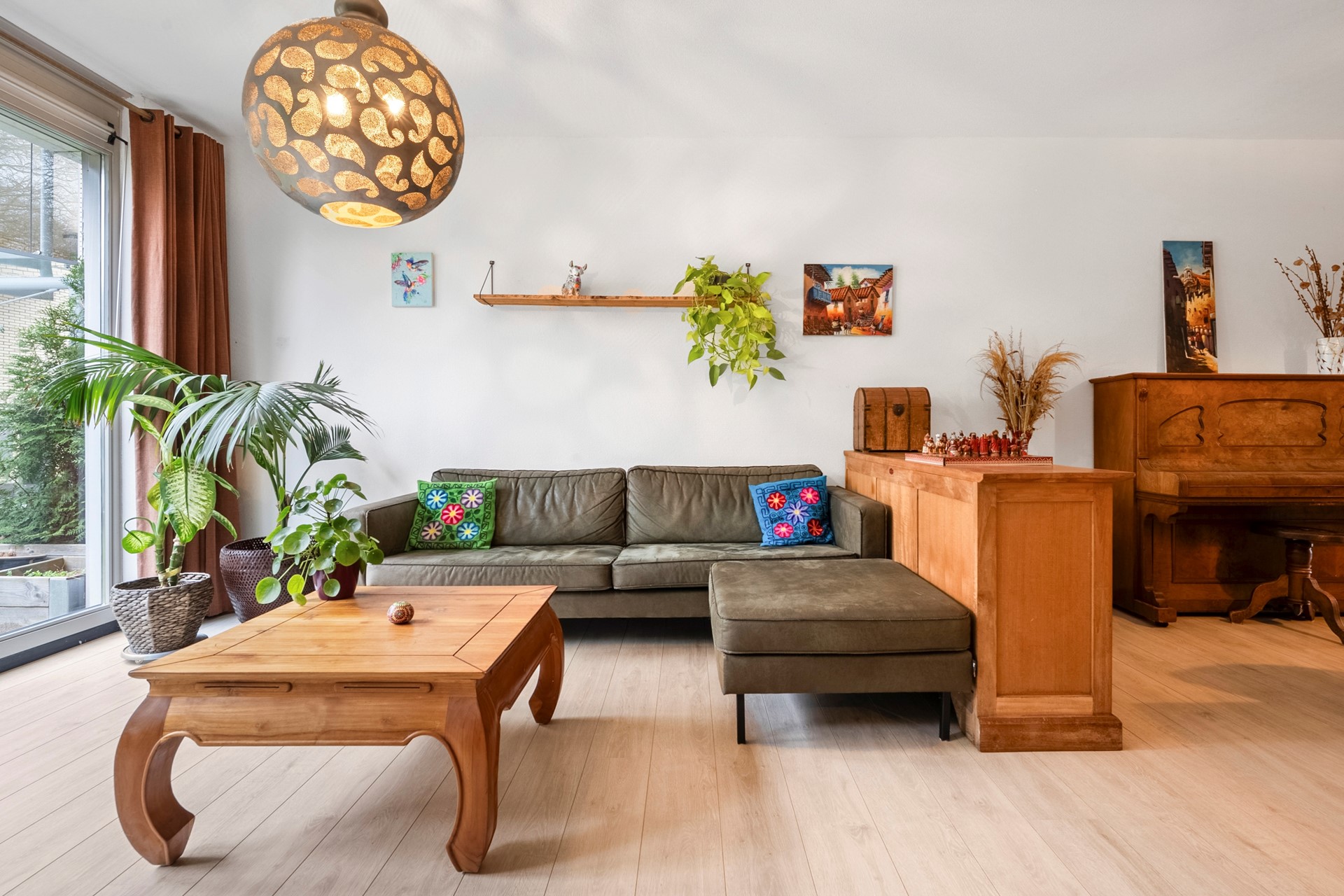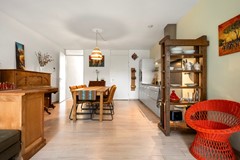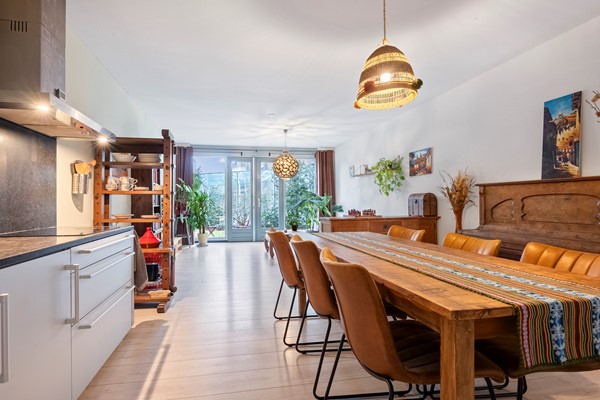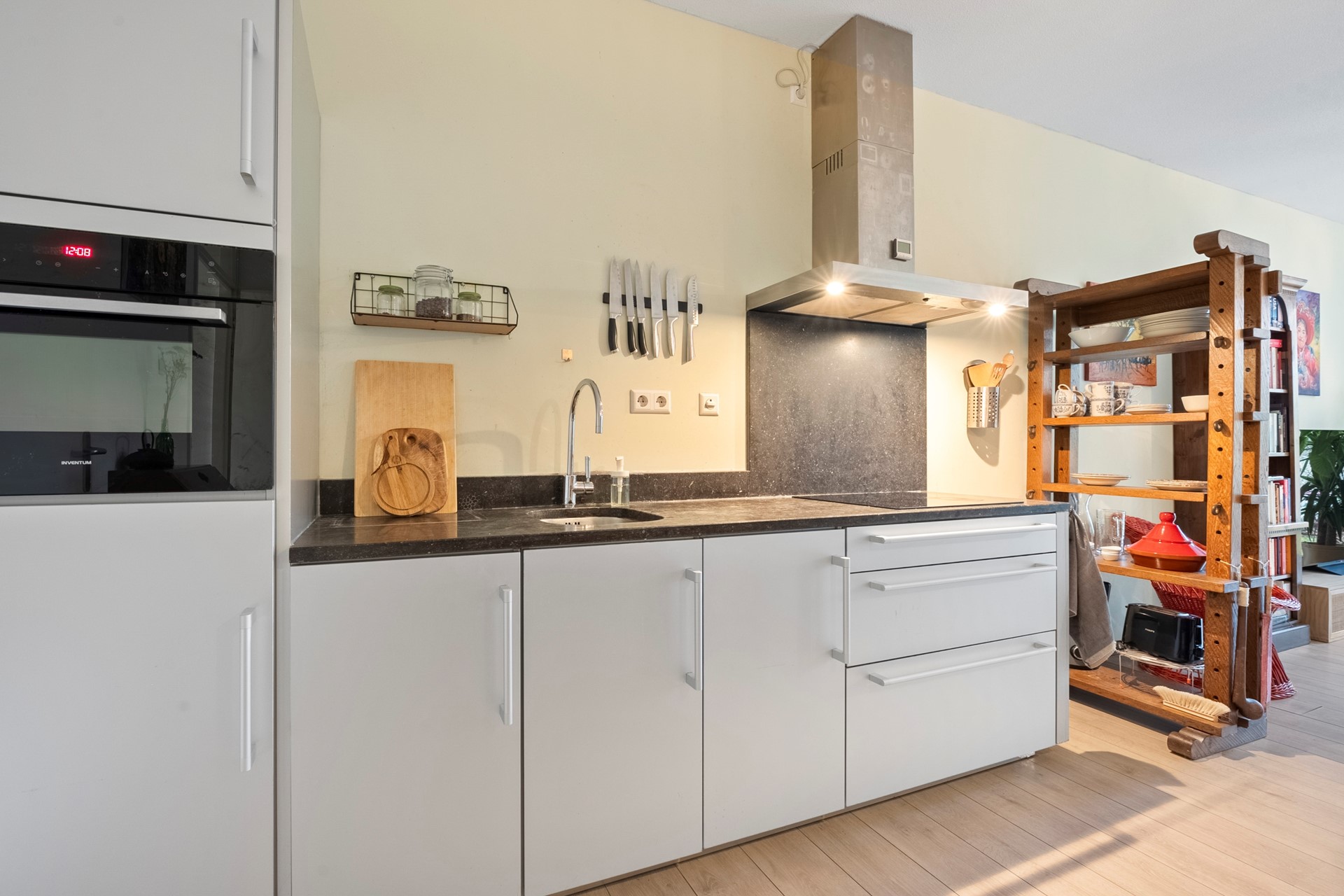 De ruime woonkamer met open keuken is praktisch ingedeeld en heerlijk licht dankzij de grote glazen pui aan de achterzijde. De keuken biedt veel werk- en kastruimte en grenst aan een inpandige berging met wasmachineaansluiting.