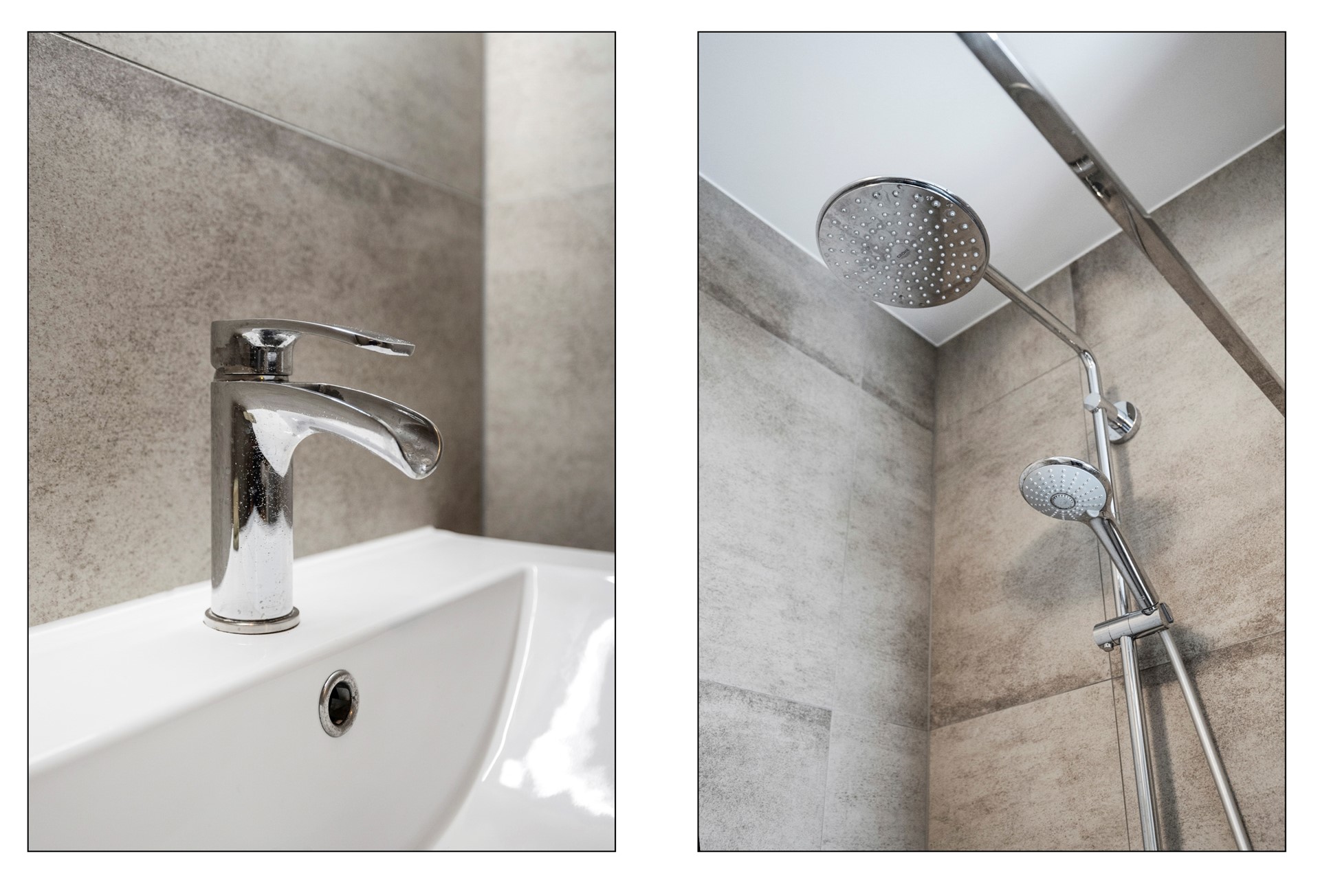 At the front of the apartment is the generous bedroom, with direct access to the neat bathroom (2023) featuring a washbasin and walk-in shower. The hallway also leads to the separate toilet.