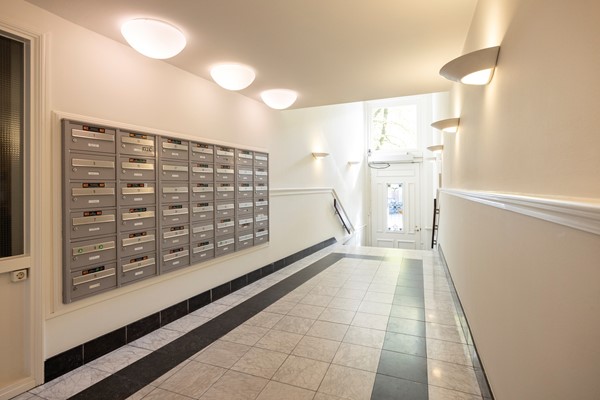 Gezamenlijke entree met royale hal, bellentableau, brievenbussen, trappenhuis, lift, gezamenlijke fietsenberging.