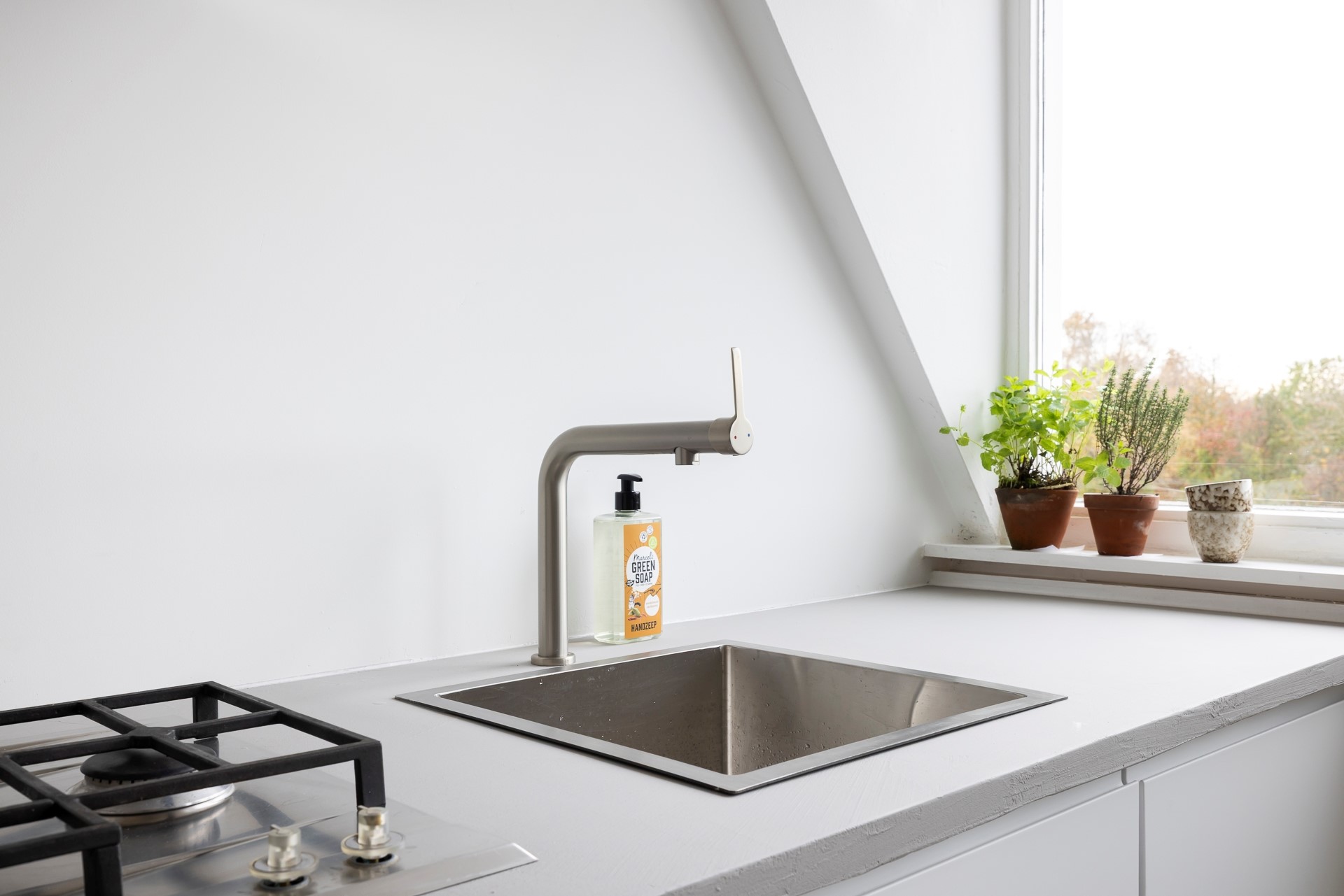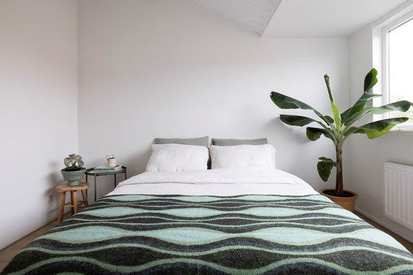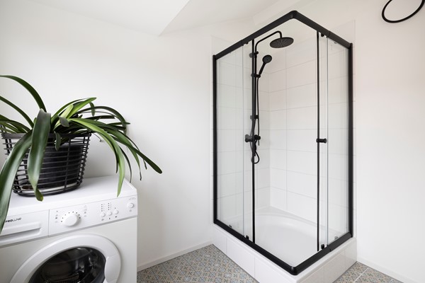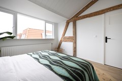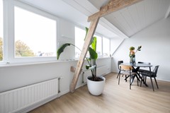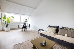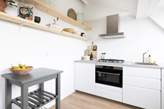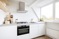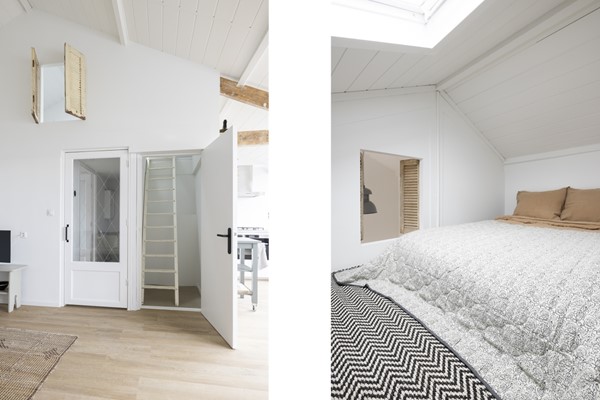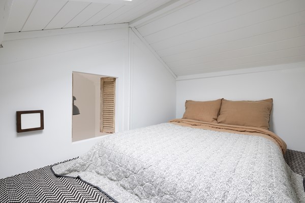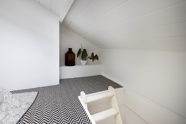 On the second floor you enter the hall, which provides access to the various rooms. At the front is the living room with open kitchen. There are windows across the full width which, together with the south-facing position, bring in lots of light. The living room has a ceiling height at the ridge of almost 4 metres, creating a wonderful sense of space. Have you noticed the beautiful wooden beams? Next to the kitchen there is a fixed staircase to the sleeping loft. Here you’ll find an extra room with playful shutters overlooking the living room. There is also a roof window for lovely daylight. At the rear of the home you’ll find the large bedroom and the bathroom with vanity, shower and washing machine connection. Off the hall is the separate toilet.