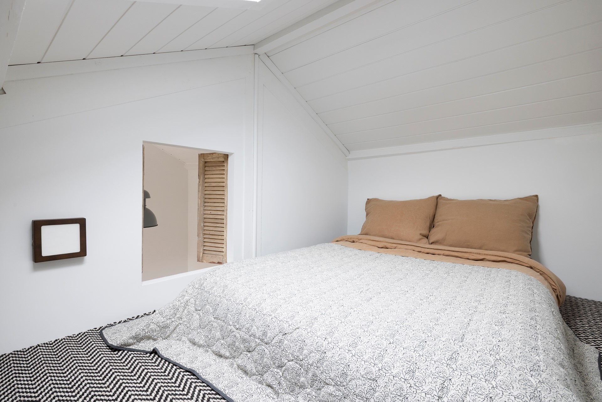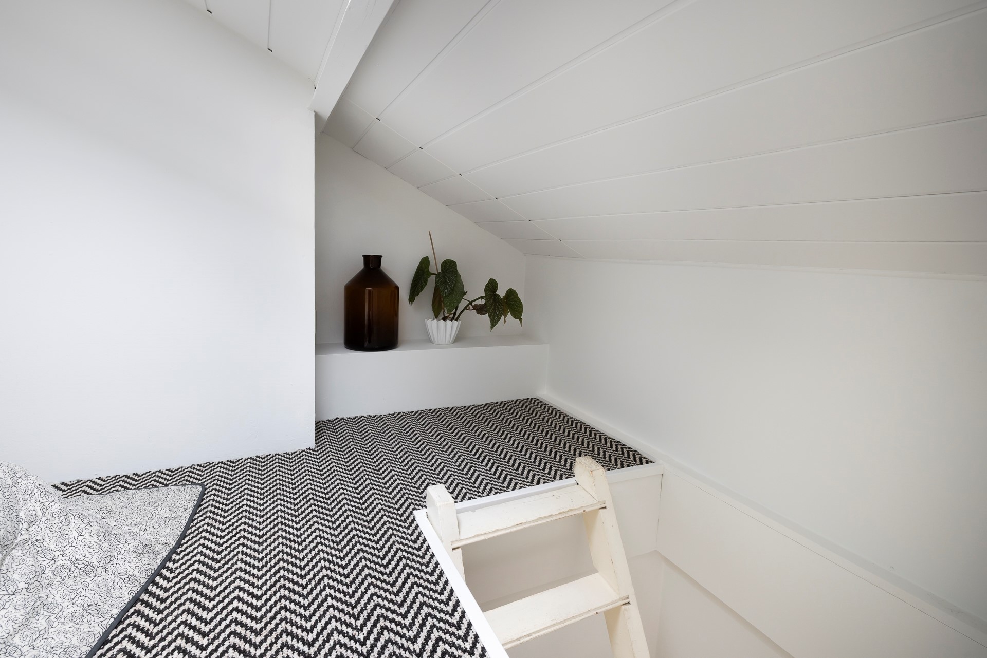 Sometimes you come across homes that have already been renovated and are so atmospheric you can move straight in. The apartment is on the second floor, so there are no upstairs neighbours. There is a good bedroom at the rear and a playful bedroom created in the loft. This is one you simply have to see in real life. How fun are those shutters from the sleeping loft to the living room, which has a ceiling height at the ridge of almost 4 metres! Several homes in the street have already been extended upwards, which would also be a great option here if you’d like more space.