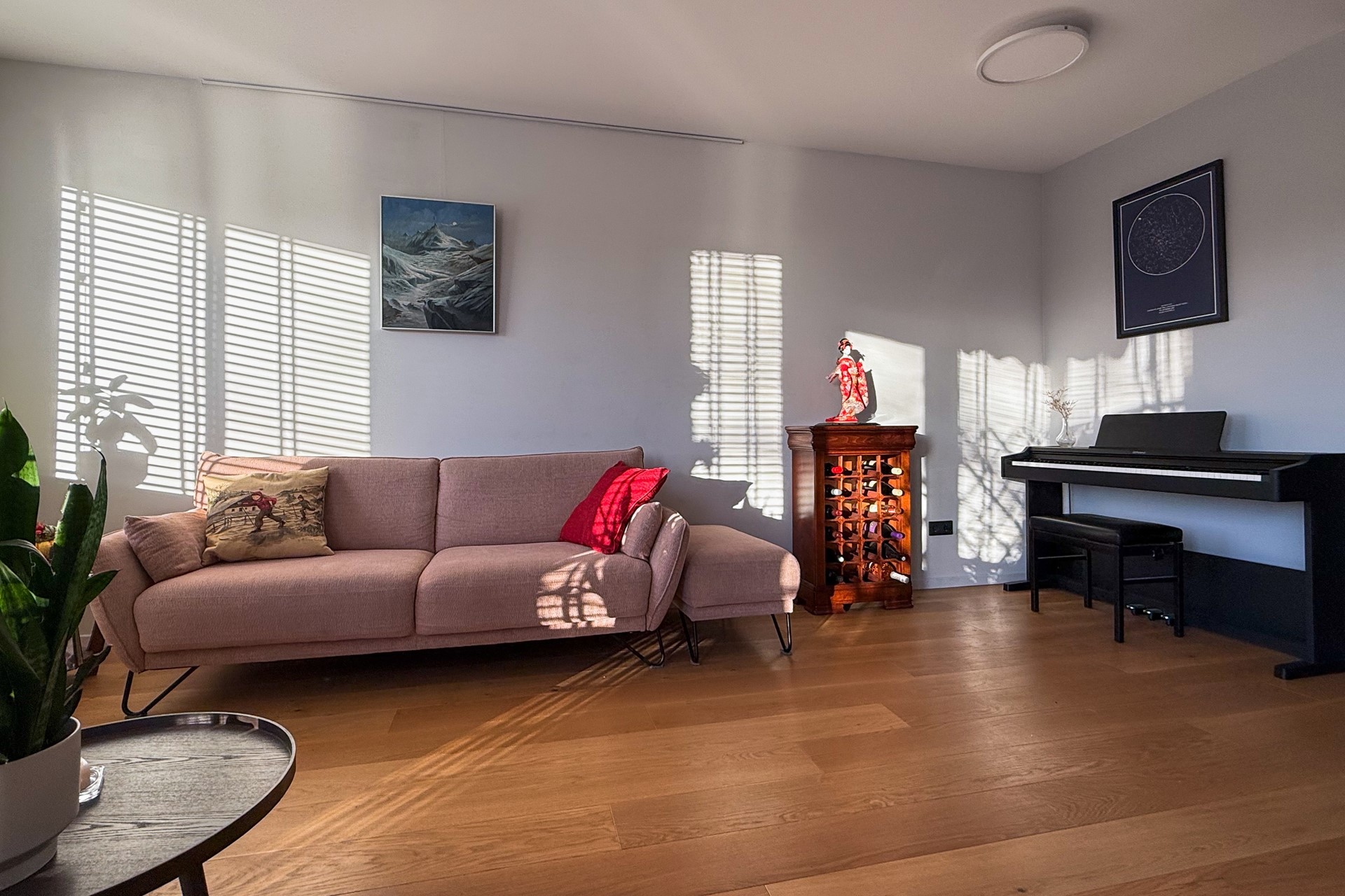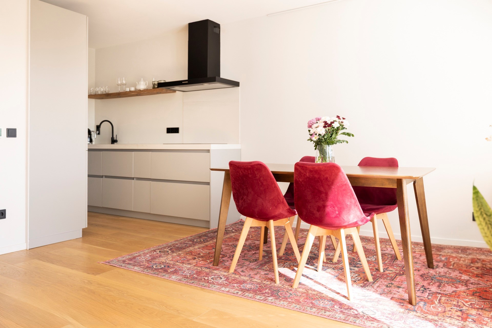 After taking the stairs or lift, you walk along the gallery to a corridor where the front door is located. Once inside the apartment, you enter the hallway which gives access to the bathroom and the two bedrooms. At the end of the hallway, you arrive in the bright and spacious living room with a beautiful modern open-plan kitchen with plenty of storage space and various built-in appliances (large fridge/freezer, induction hob and dishwasher). From the living room you have access to the sunny south-facing balcony where you can enjoy unobstructed views over the old historic city. The entire apartment features a beautiful oak parquet floor.
