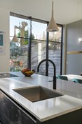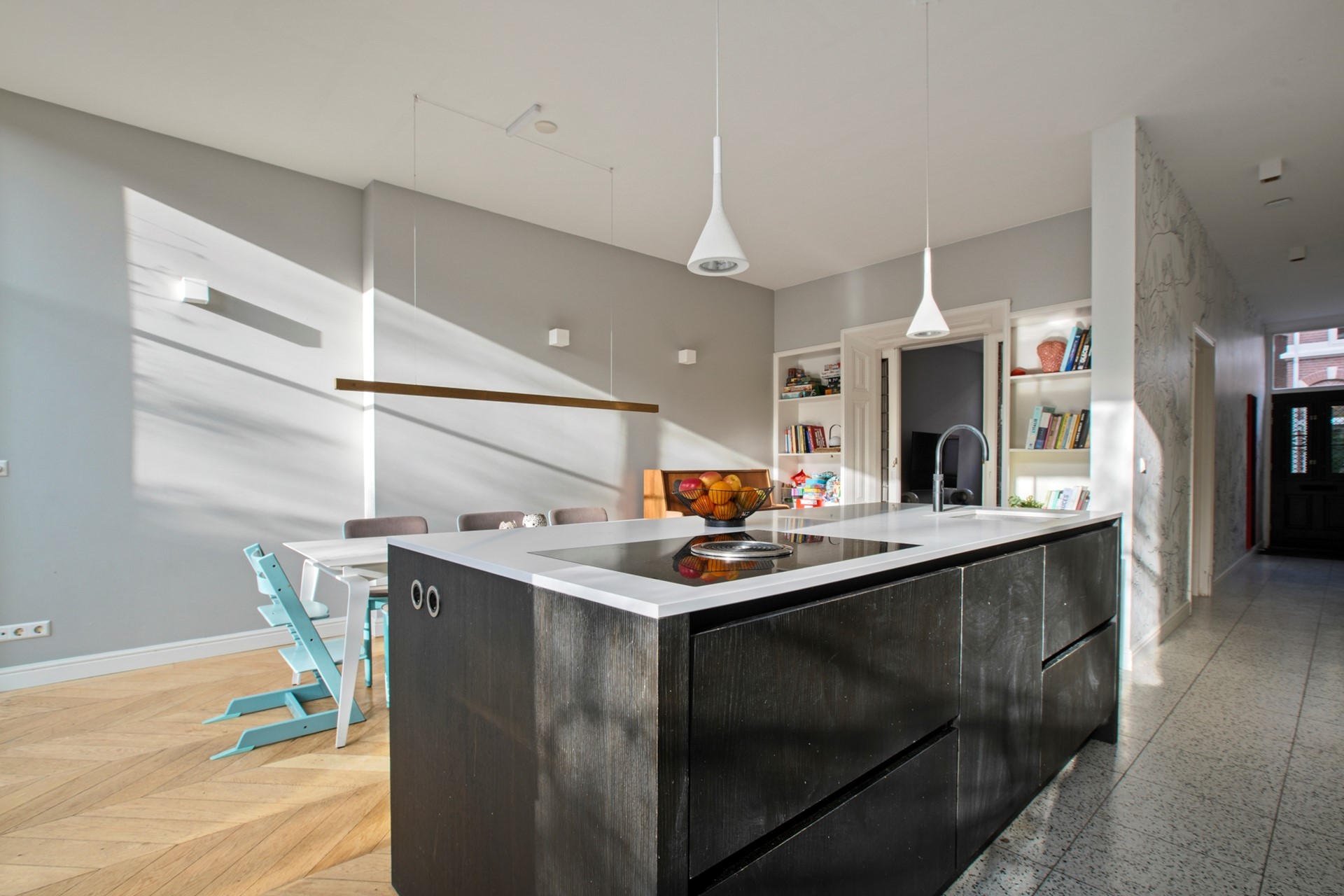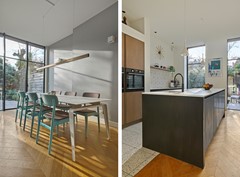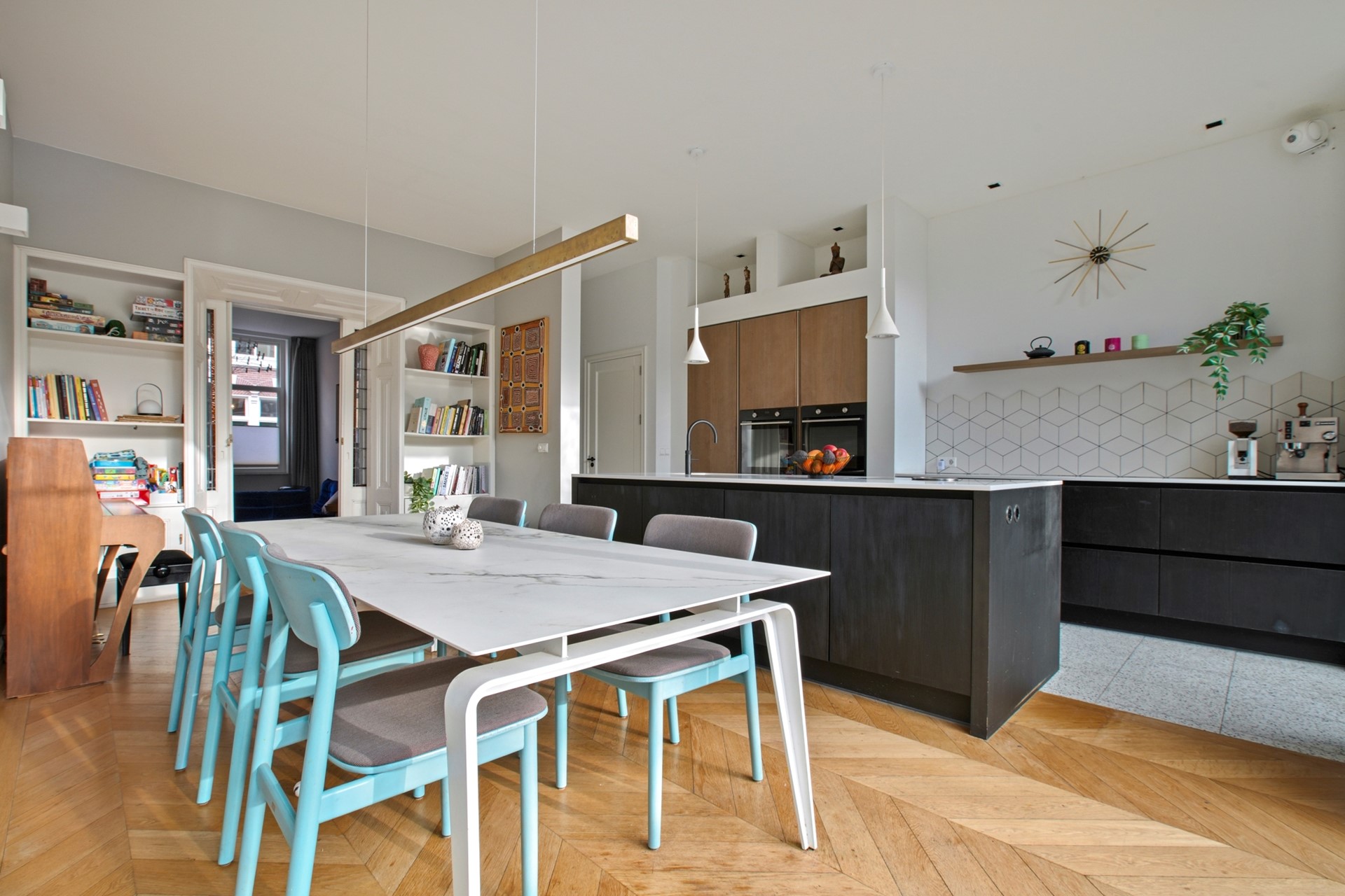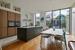 At the front of the house is the charming living room with elegant en-suite doors and built-in cupboards on both sides. At the rear, the property has been extended across the full width and fitted with a robust anthracite-grey façade with tall windows, providing an abundance of natural light. This area houses the modern open-plan kitchen, fully equipped with built-in appliances including an induction cooktop with Bora extraction system, Quooker, dishwasher, double ovens, and a fridge-freezer combination.