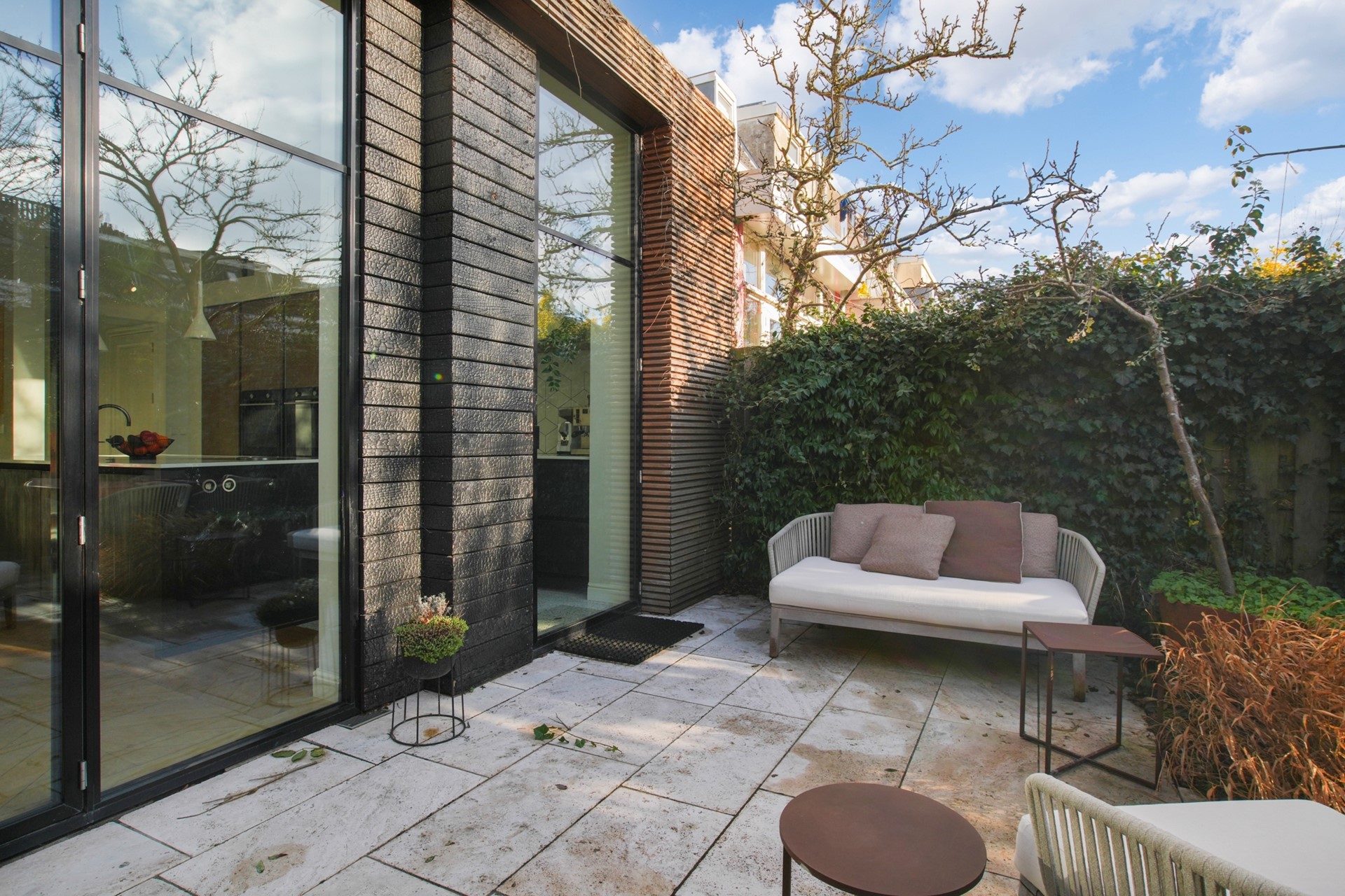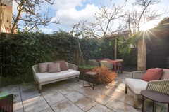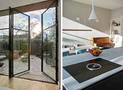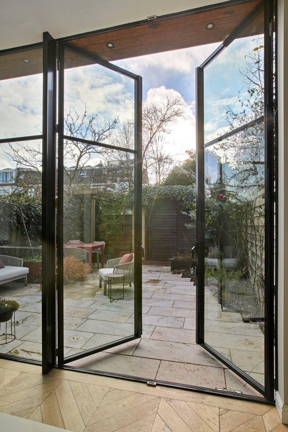The extension is stylishly finished with a distinctive combination of wood materials. Through the tall French doors, you have direct access to the sunny southwest-facing garden with a detached shed.