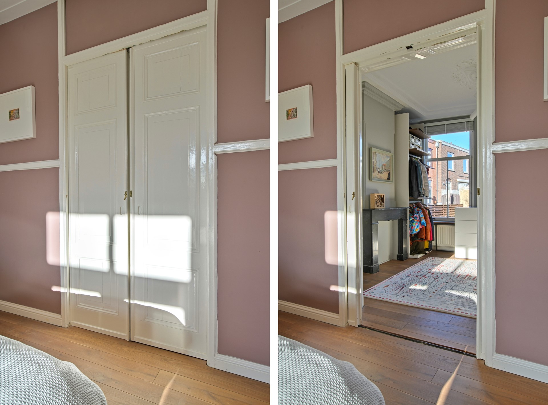 Landing with practical cupboard space for washing machine and dryer. The generous master bedroom has an en-suite connection to the front room, currently used as a walk-in closet. The modern and spacious bathroom features a bathtub, separate shower with rain shower, washbasin, toilet, and underfloor heating. At the street side, there is a third bedroom.