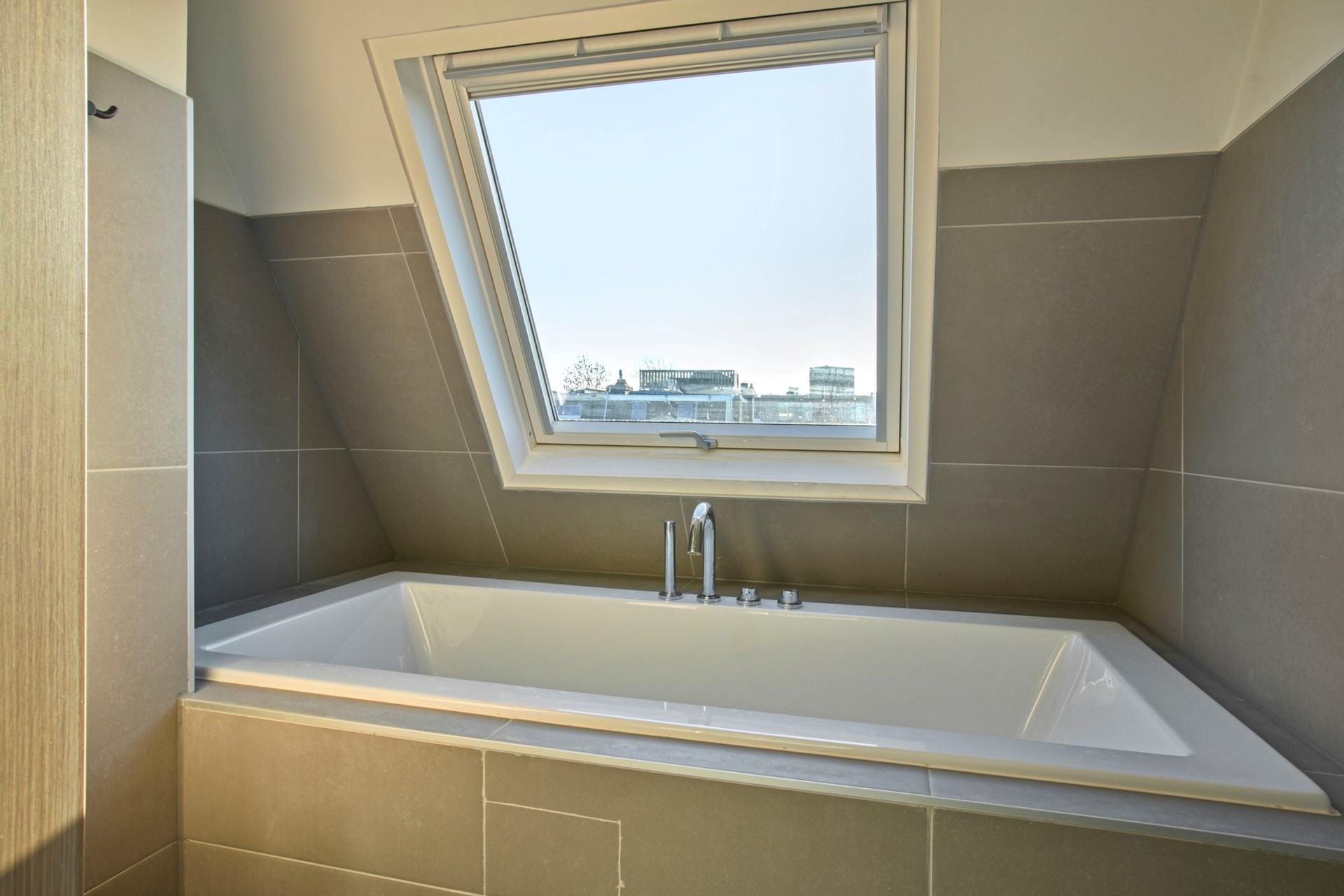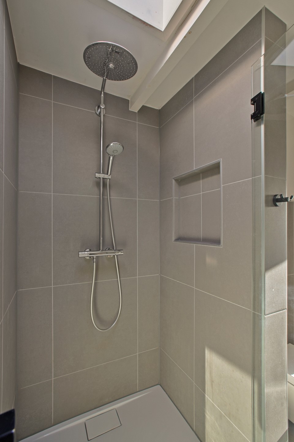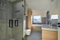 Landing with skylight and central heating installation (Nefit, 2014). This floor comprises two spacious bedrooms and a third, slightly smaller bedroom at the front. The second modern bathroom is equipped with a bathtub, separate shower with rain shower, washbasin, toilet, and underfloor heating.