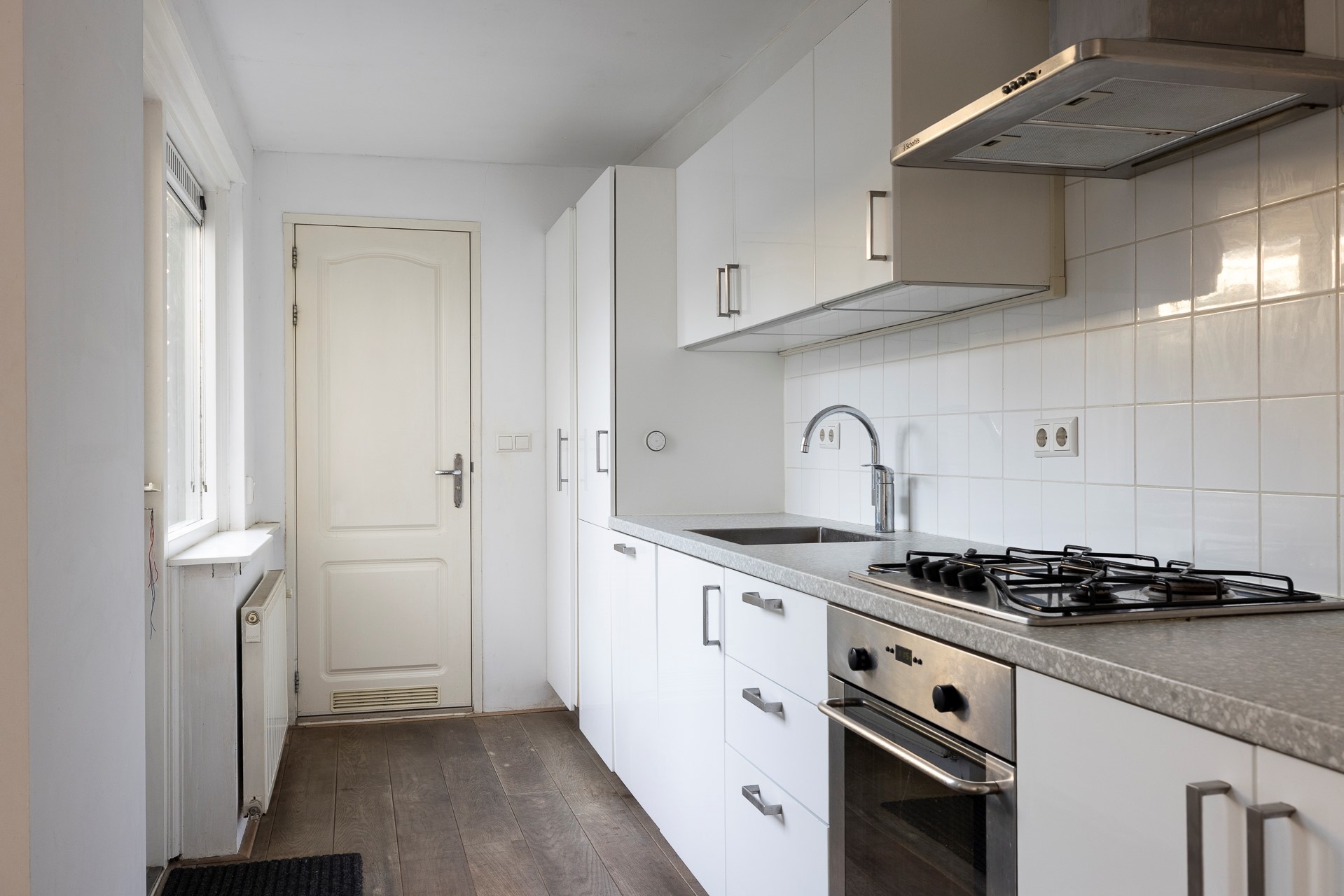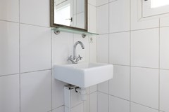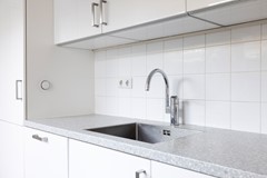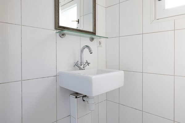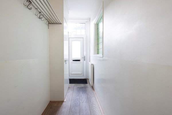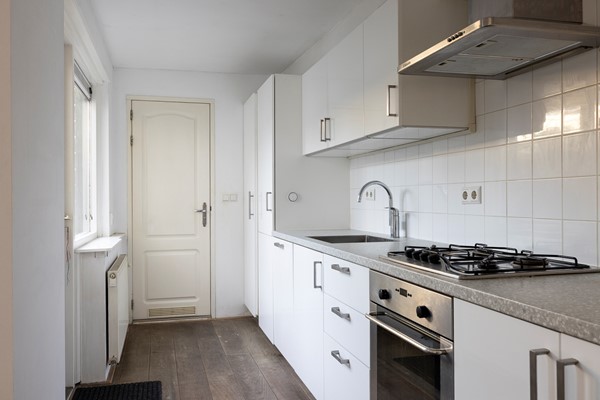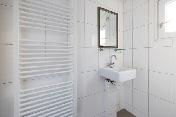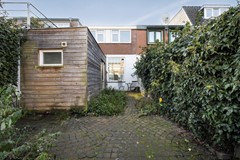 You enter the hallway with the renewed meter cupboard (2004). On the ground floor the property has a concrete floor, so there are no wooden joists anymore. At the end of the hallway you will find the staircase to the first floor and the door to the living room. The living room has high ceilings and an oak slatted parquet floor that can still be sanded if desired. At the rear of the property you will find the kitchen with built-in appliances. These include an oven, a fridge/freezer combination, a dishwasher and a 4-burner hob. The washing machine and dryer are also built into a cupboard here, neatly out of sight. In the kitchen you have instant hot water via the close-in boiler. Behind the kitchen is the first bathroom with a shower, washbasin and toilet. The rear garden is a good size and has rear access.