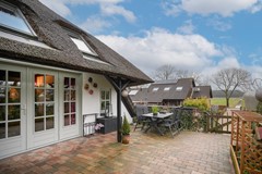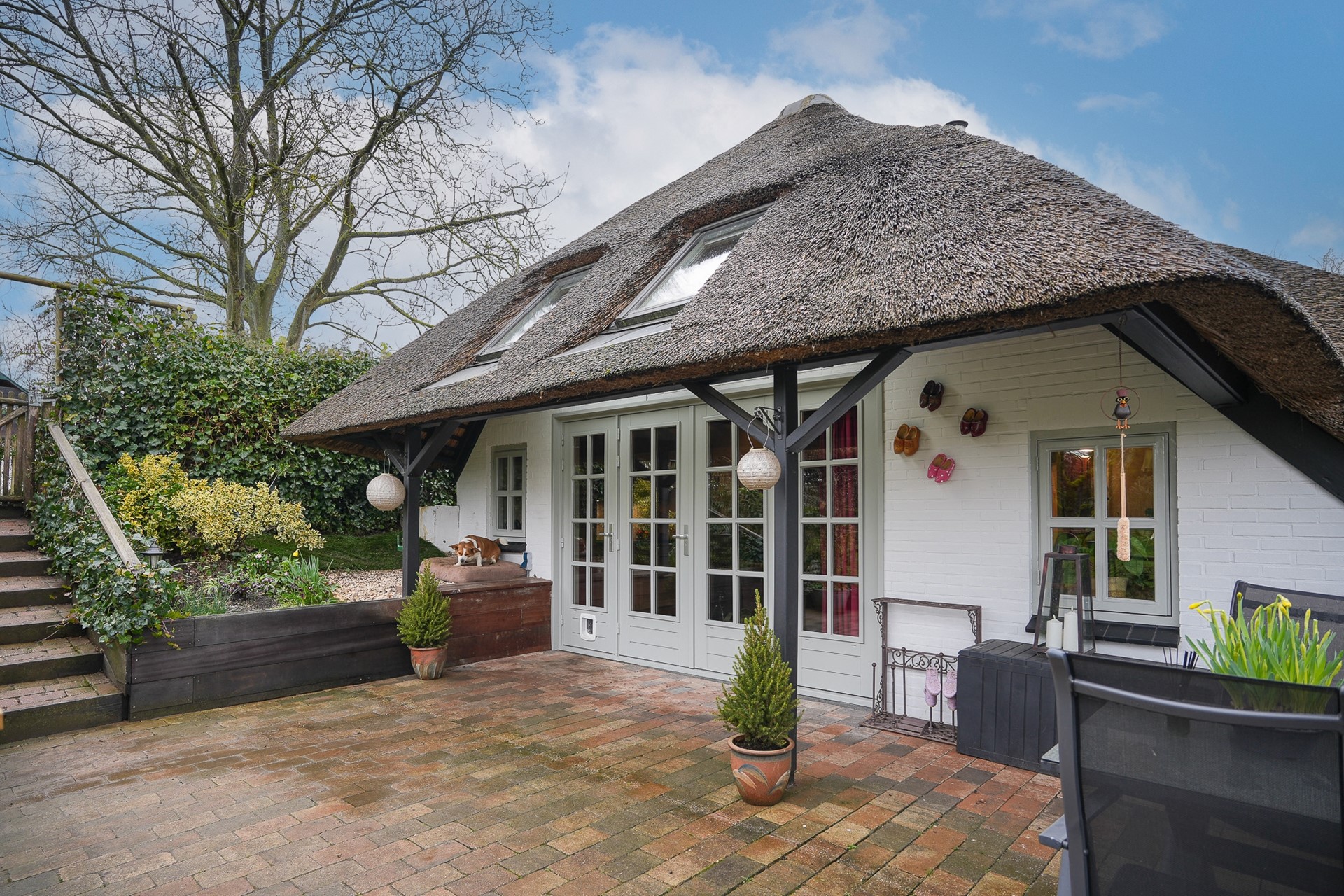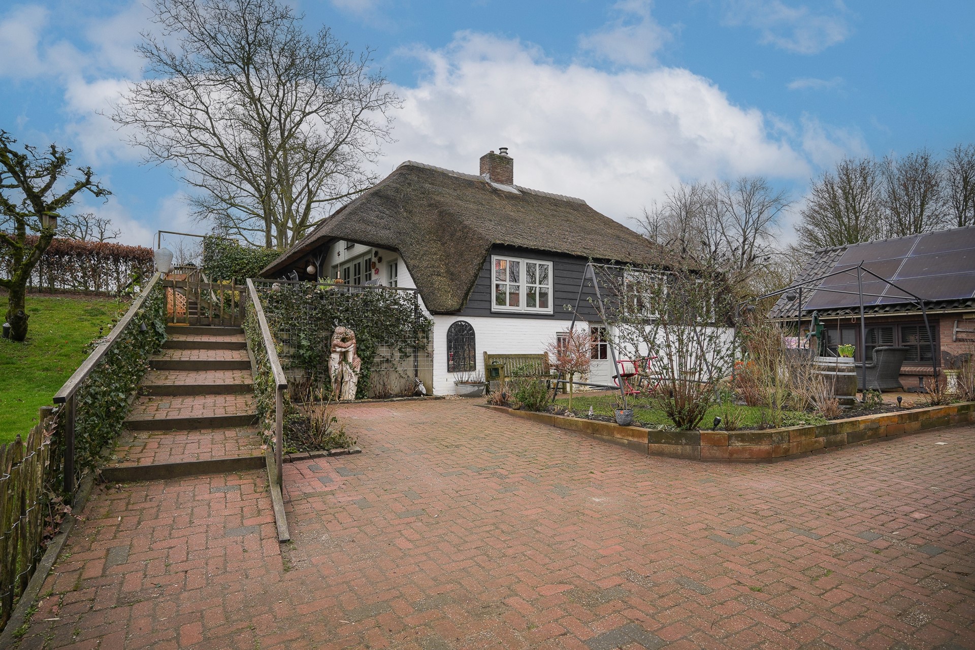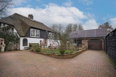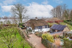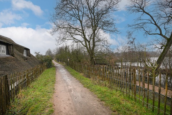 Via de eigen oprit vanaf de Groeneweg bereik je het perceel. De woning ligt beschut en het rieten dak geeft direct die charmante uitstraling die je bij een dijkwoning hoopt te vinden.