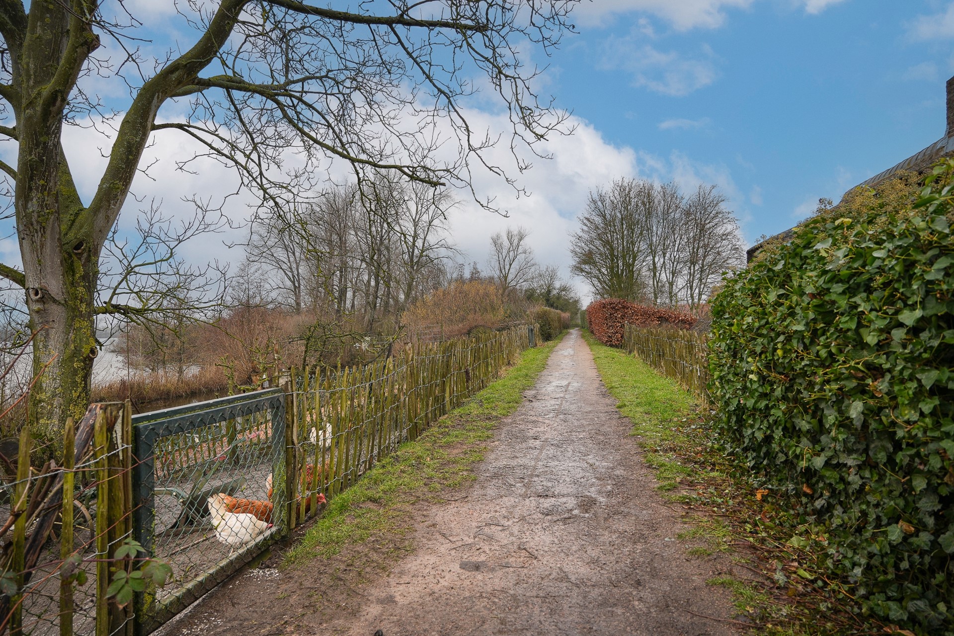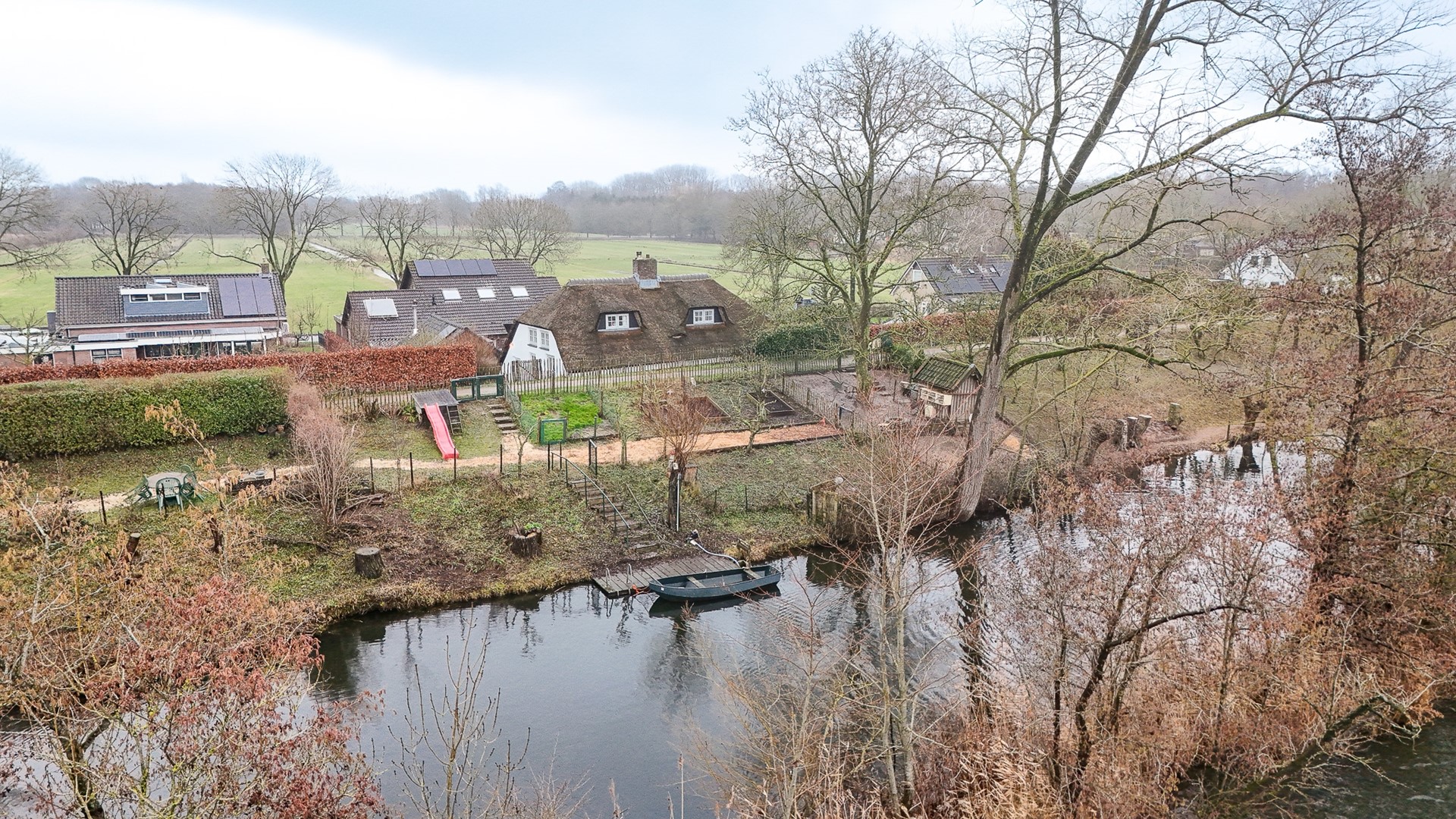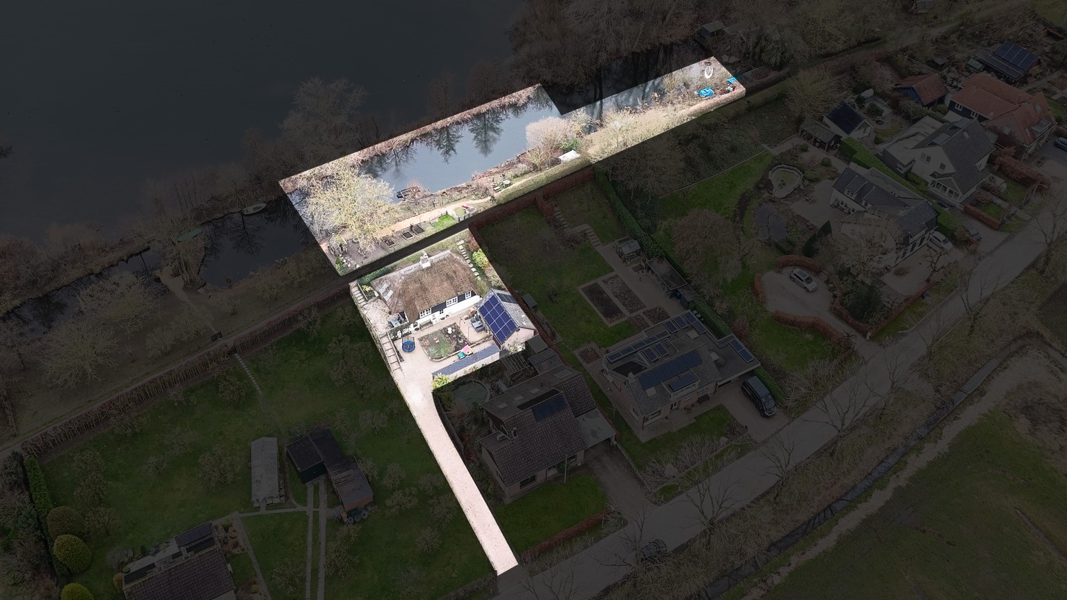 Via de eigen oprit vanaf de Groeneweg bereik je het perceel. De woning ligt beschut en het rieten dak geeft direct die charmante uitstraling die je bij een dijkwoning hoopt te vinden.