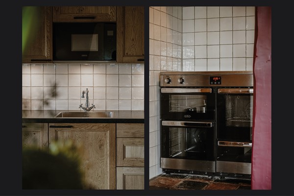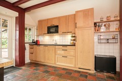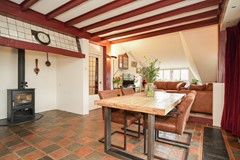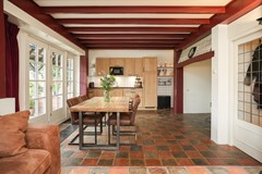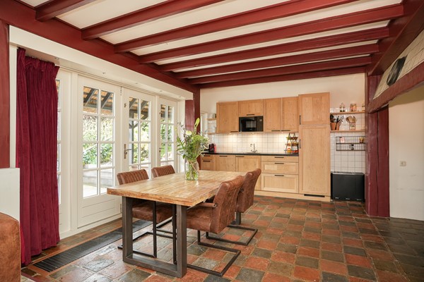 Hiernaast bevindt zich de eetkamer met aansluitend de keuken. Deze ruimte is de afgelopen jaren gemoderniseerd en vormt een fijne plek om samen te komen, mede dankzij de houtkachel die een centrale plek inneemt. Vanuit hier heb je zicht op het terras en het groen. De combinatie van oud en nieuw is hier mooi in balans.