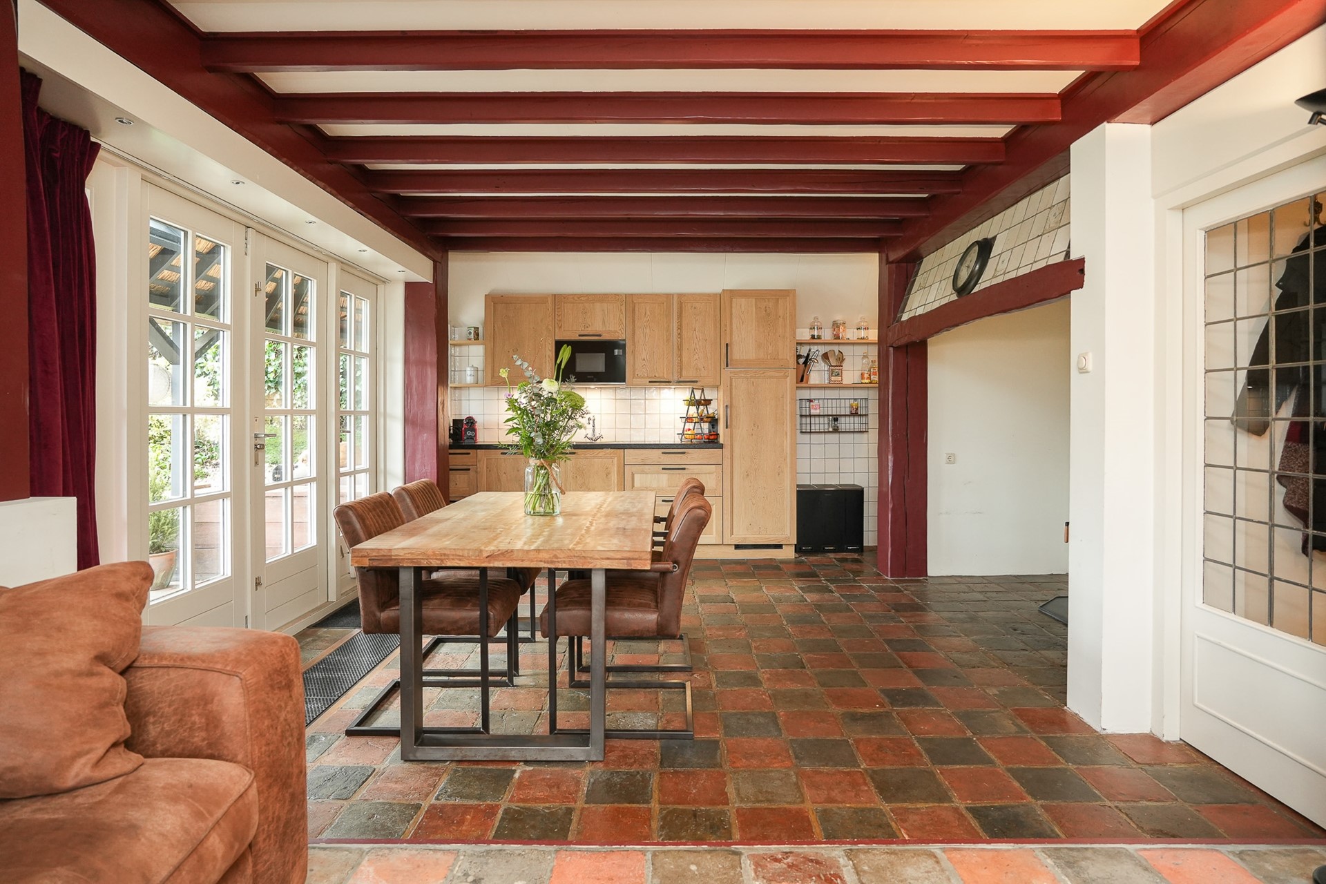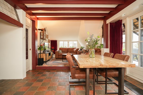Je komt binnen in de keuken, zoals dat hoort, waar de sfeer direct voelbaar is. Authentieke details zoals de estrikken vloer en zichtbare balken zorgen voor warmte en karakter.
