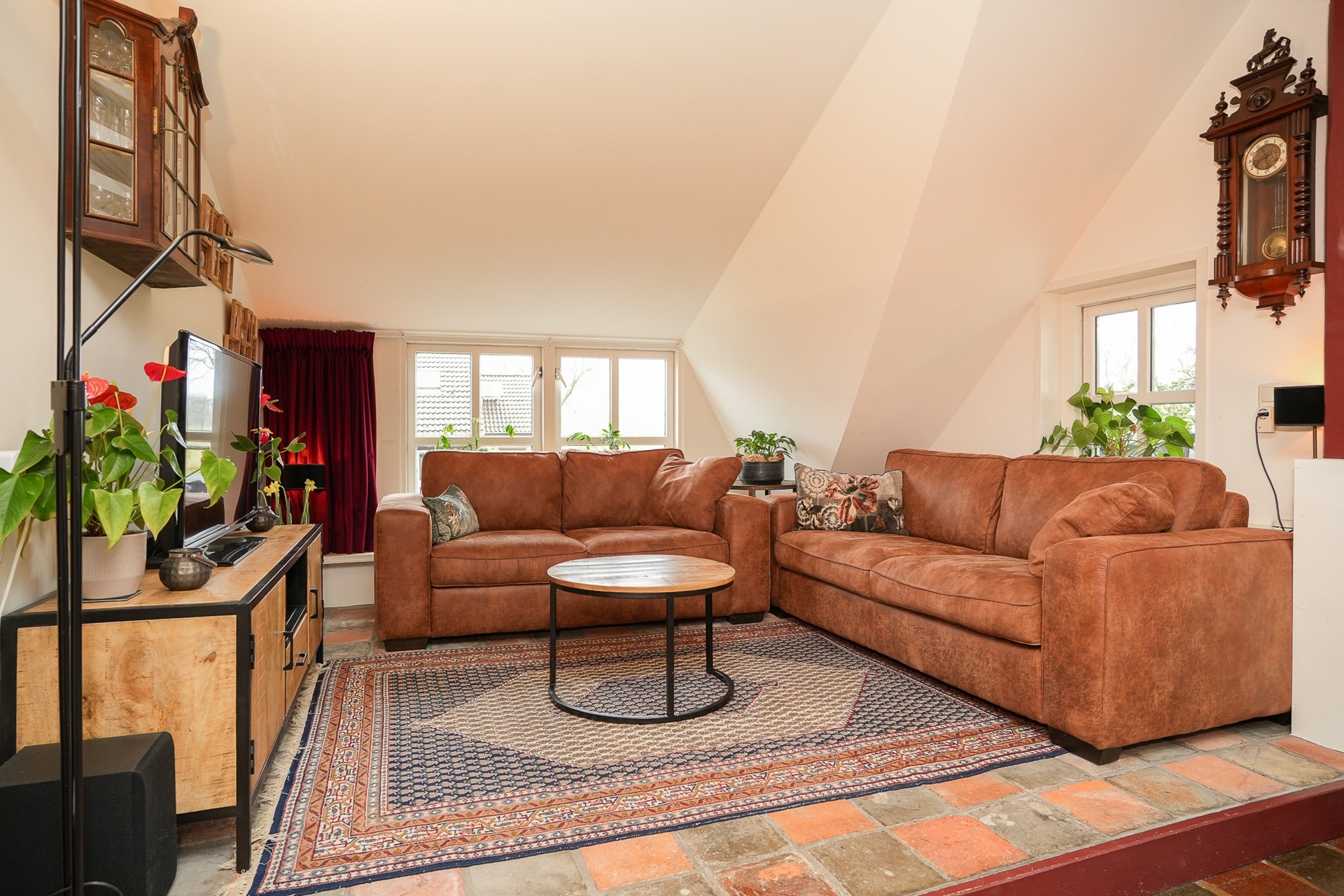 De woonkamer ligt aan de tuinzijde en biedt een mooi uitzicht over het groen en de lagergelegen buitenruimte. De ruimte voelt knus en sfeervol. Hier zit je beschut en toch met verbinding naar buiten.