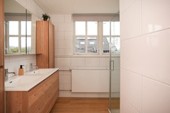 De moderne badkamer ligt eveneens op dit niveau en is verzorgd uitgevoerd. De badkamer is voorzien van een dubbele wastafel en ruime inloopdouche. Het raam zorgt voor voldoende daglicht. In de gang is er een separaat toilet aanwezig.