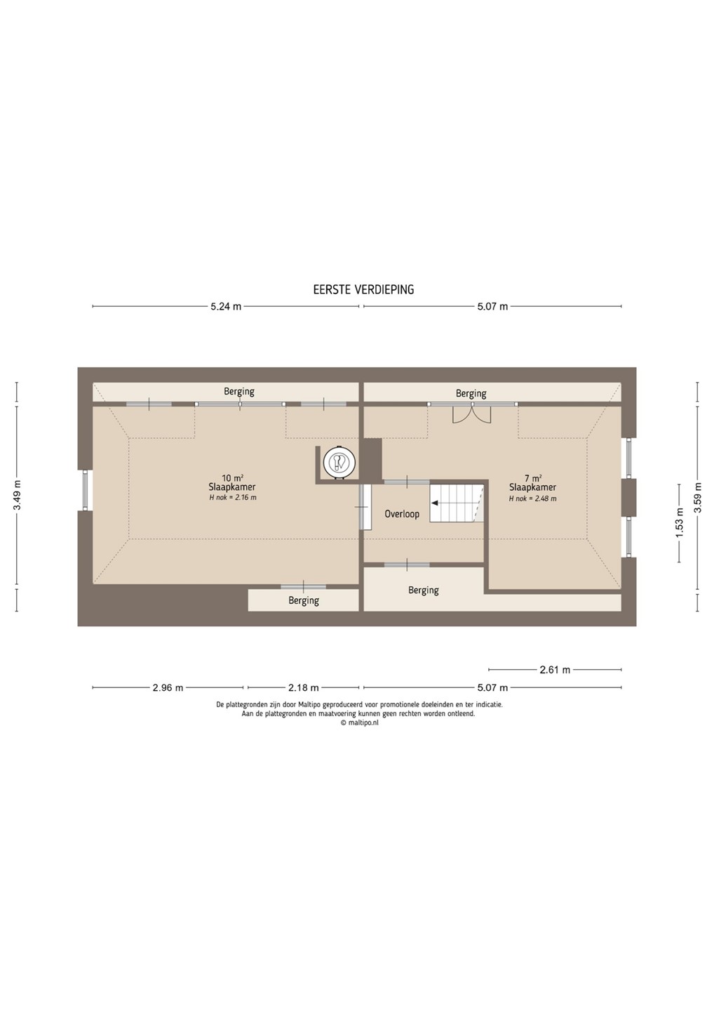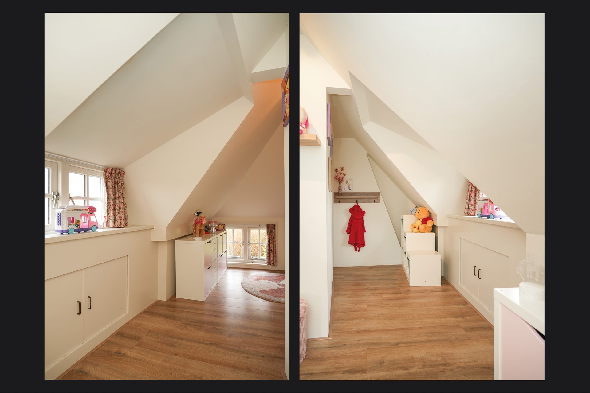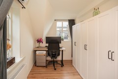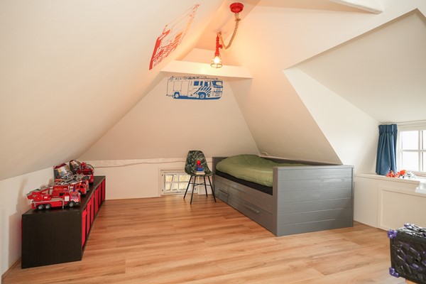 Via de trap kom je op de overloop van de eerste verdieping. Onder de schuine kap bevinden zich twee slaapkamers. Door de dakvorm hebben de kamers een speelse indeling en veel bergruimte achter de knieschotten.