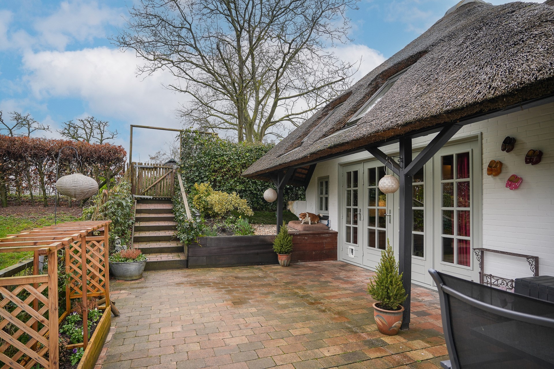 Aan de dijkzijde ligt de tuin rondom de woning. Hier vind je meerdere terrassen en zitplekken, zodat je op verschillende momenten van de dag een fijne plek in de zon of schaduw hebt. Het hoogteverschil tussen dijkniveau en het lagergelegen deel van de tuin zorgt voor een speels karakter.