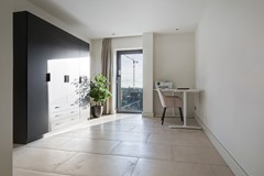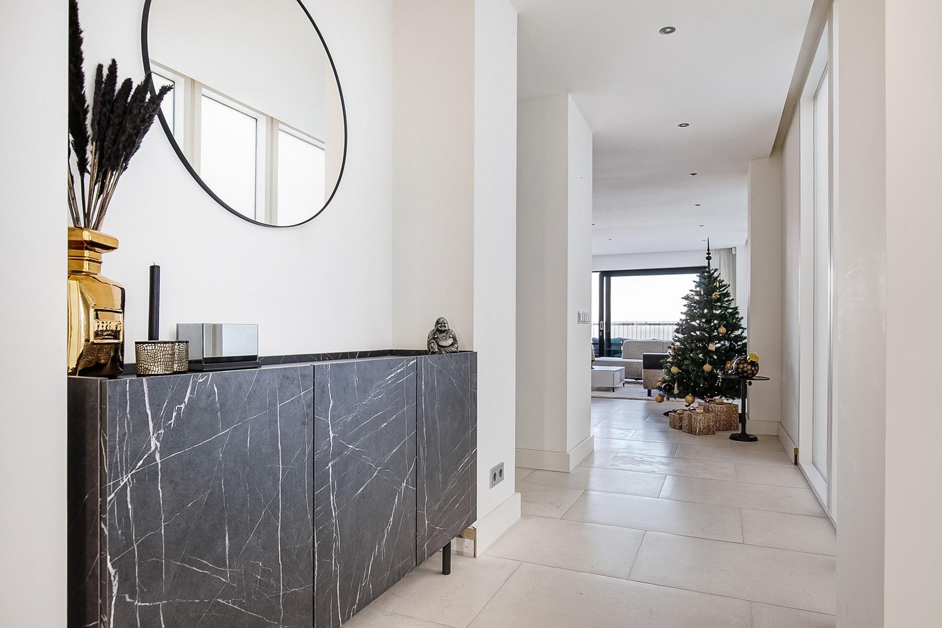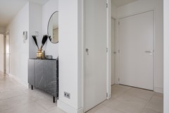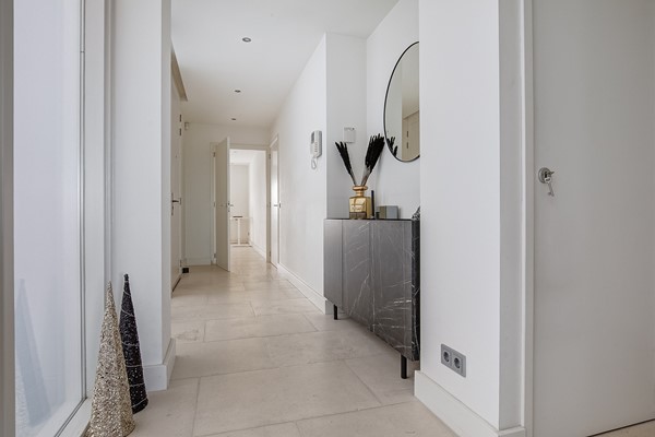 Via de entree van het appartement stapt u binnen in een riante hal, die op stijlvolle wijze toegang biedt tot alle vertrekken. In de hal bevinden zich tevens een luxe separaat toilet, evenals een bergruimte waar de technische installaties en de wasmachine-opstelling zijn ondergebracht.