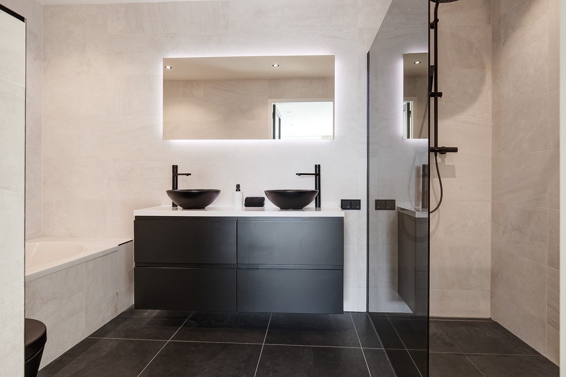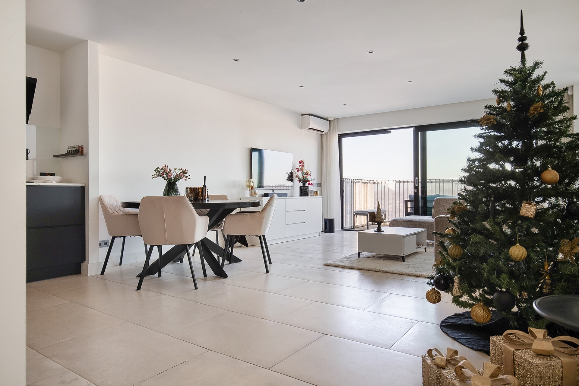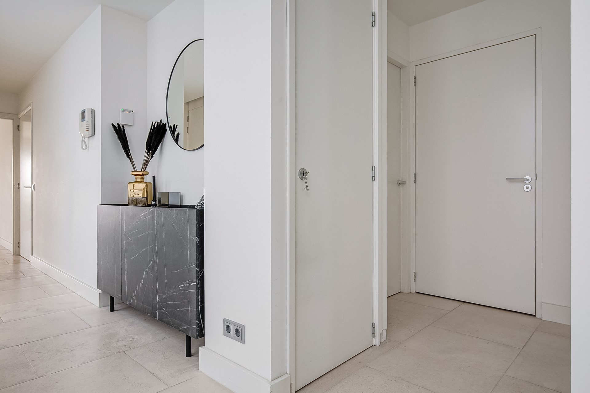The apartment features two bedrooms, including a spacious master bedroom with a serene and comfortable atmosphere. This room is fitted with large sliding doors, allowing the morning sun to flood the space beautifully. From the master bedroom, you have direct access to the modern and luxuriously finished bathroom, which is equipped with underfloor heating, a toilet, a generous walk-in shower with a rainfall shower and glass partition, a comfortable bathtub, an elegant double vanity unit with two washbasins, and a heated mirror with integrated lighting. The second bedroom is flexibly designed, making it ideal for use as a guest room, study, or home office.