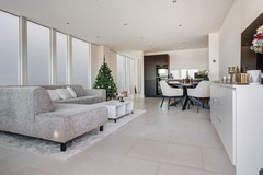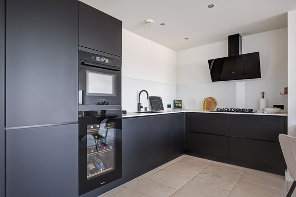 De zeer riante living vormt het hart van de woning en wordt gekenmerkt door een grote raampartij die zorgt voor een overvloed aan natuurlijk licht. De stijlvolle open keuken sluit naadloos aan op de leefruimte en is modern uitgevoerd met hoogwaardige inbouwapparatuur zoals oa een ingebouwde wijnklimaatkast. Een ideale plek voor wie graag kookt in een luxe en comfortabele omgeving. Vanuit de living heeft u direct toegang tot het terras van circa 10 m². Hier kunt u vanaf de late middag tot diep in de avond genieten van het fantastische, wijdse uitzicht over Hoofddorp, een perfecte plek om te ontspannen en te genieten.