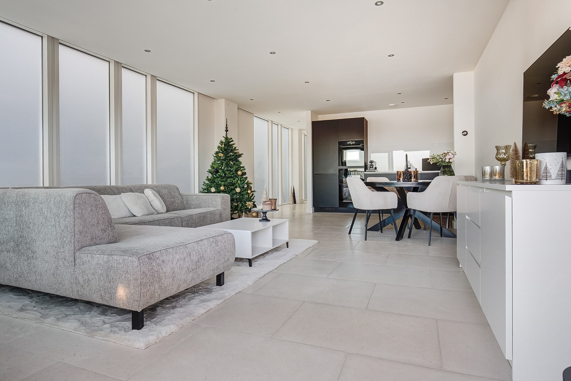 The exceptionally spacious living area forms the heart of the home and is characterized by large windows that provide an abundance of natural light. The stylish open-plan kitchen connects seamlessly with the living space and features a modern design with high-quality built-in appliances, including, among others, an integrated wine climate cabinet. This is an ideal setting for those who enjoy cooking in a luxurious and comfortable environment.