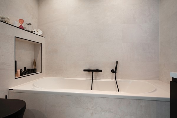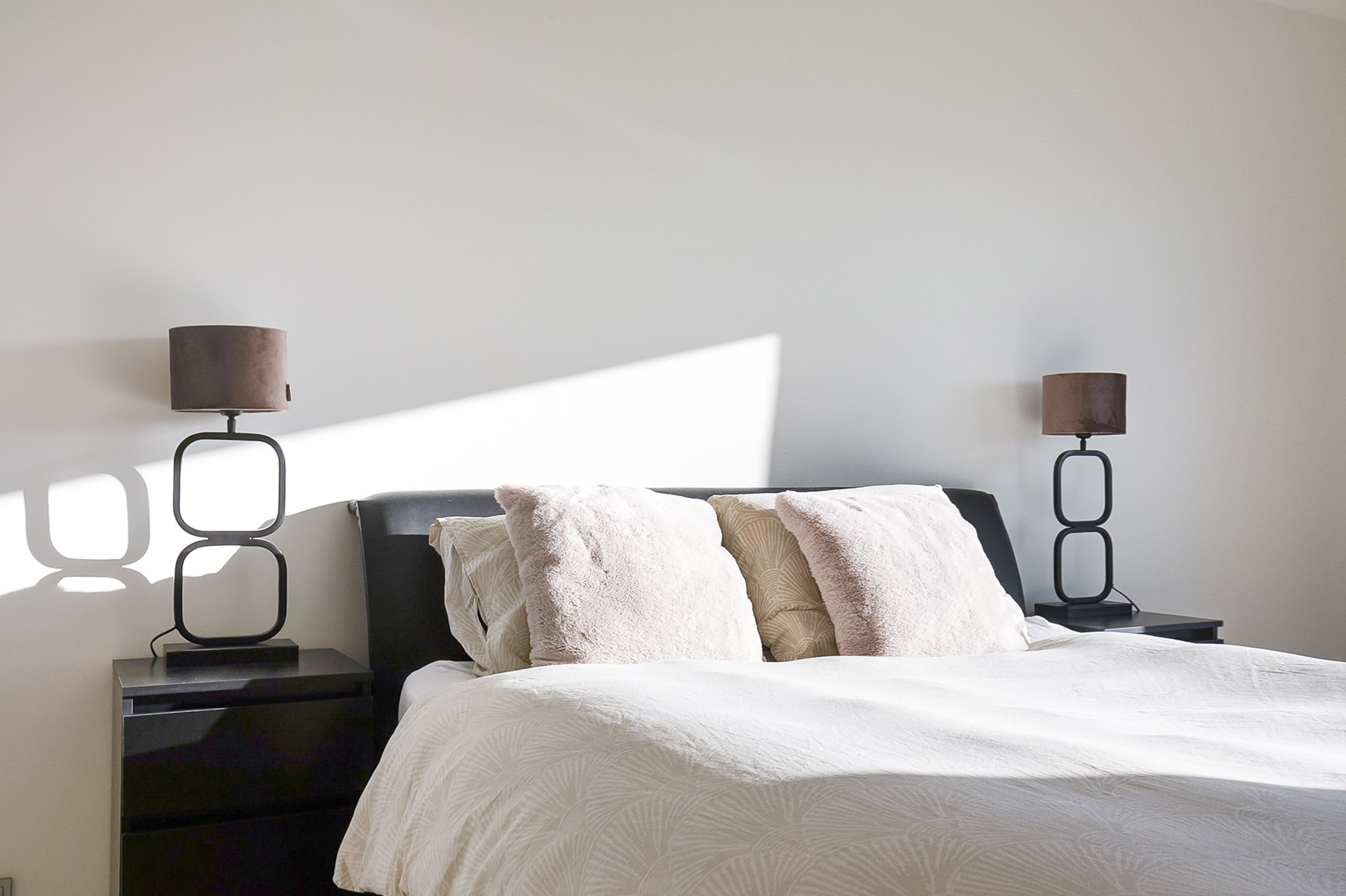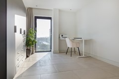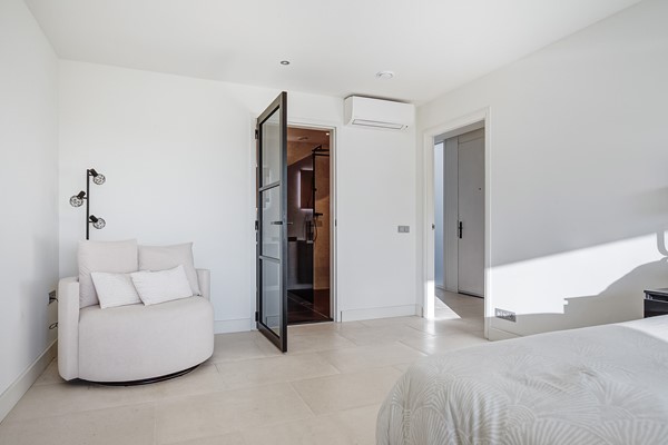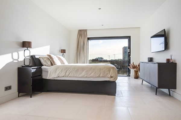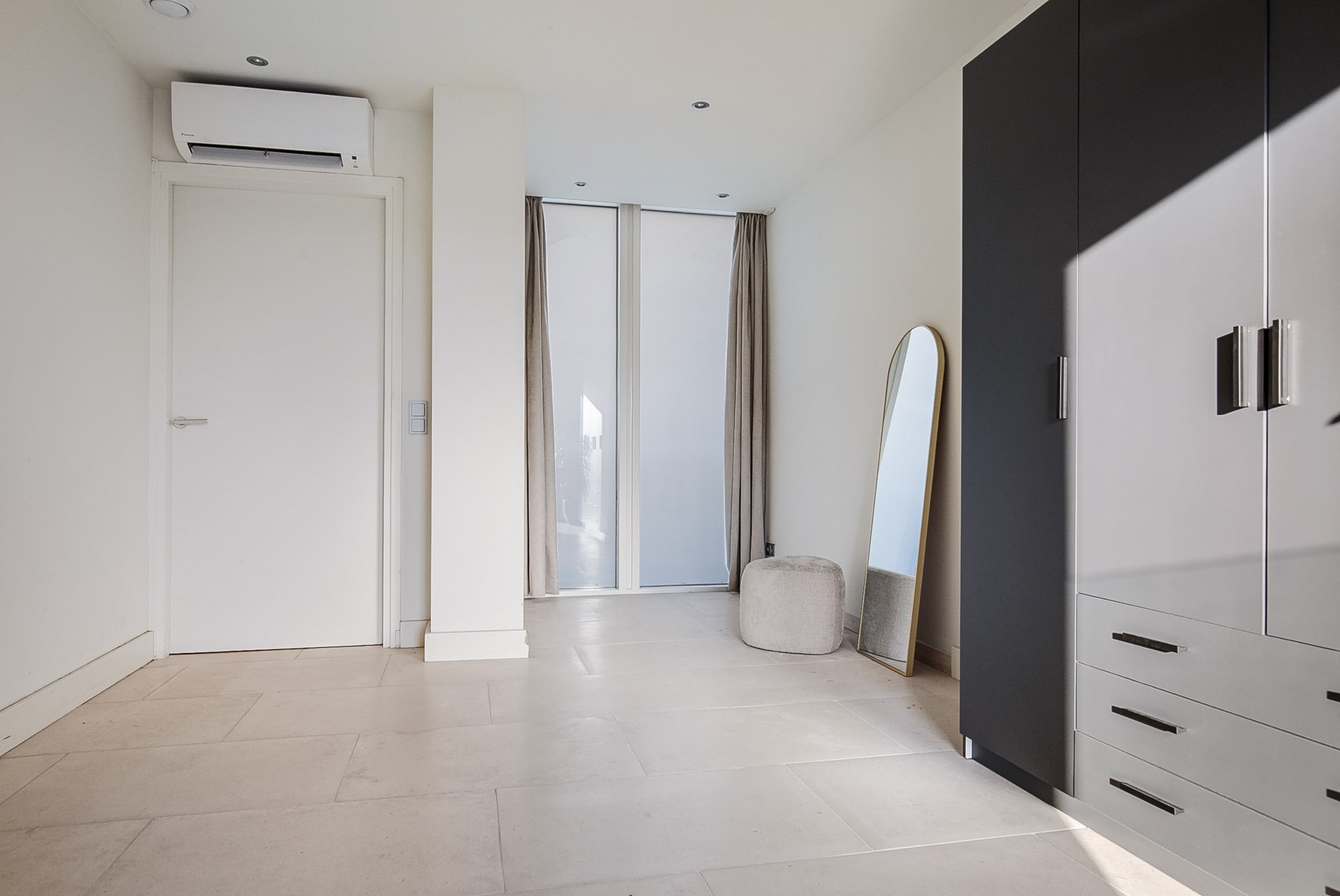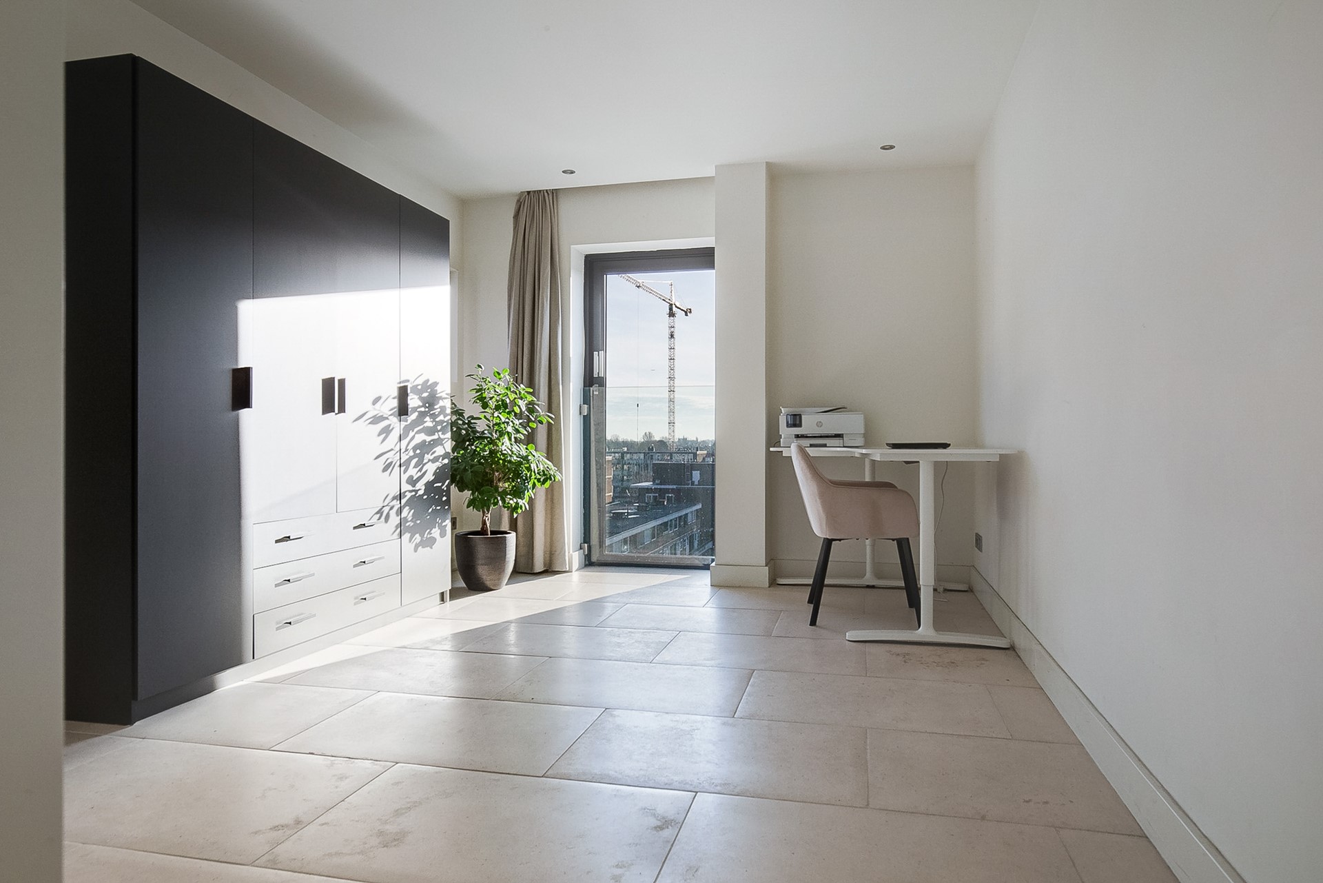 Het appartement beschikt over twee slaapkamers, waarvan de ruime hoofdslaapkamer een serene en comfortabele ambiance heeft. Deze kamer is voorzien van een grote schuifpui, waardoor de ochtendzon de ruimte prachtig binnenvalt. Vanuit deze slaapkamer bereikt u direct de moderne en luxe uitgevoerde badkamer, die is uitgerust met vloerverwarming, toilet, een riante inloopdouche v.v. een regendouche met glazen wand, een comfortabel ligbad, een elegant dubbel wastafelmeubel v.v. twee waskommen en een verwarmde spiegel met ingebouwde verlichting. De tweede slaapkamer is flexibel in te richten en daarmee ideaal als gastenkamer, studeerkamer of werkkamer.