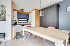 Zodra je binnenstapt, voel je het meteen: dit is een thuis met een hart. De woonkamer is breed, luchtig en vol daglicht, mede dankzij die extra ramen die je in vergelijkbare woningen níet vindt. De sfeer is open, vriendelijk en uitnodigend — een plek waar je na je werkdag met een diepe zucht neerploft op de bank, waar kinderen spelen op het vloerkleed en waar vrienden graag blijven hangen omdat het hier zo’n relaxte, warme vibe heeft.