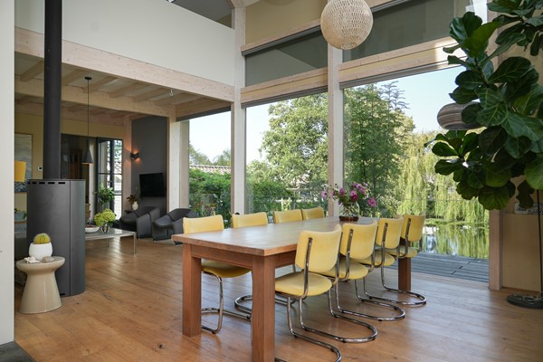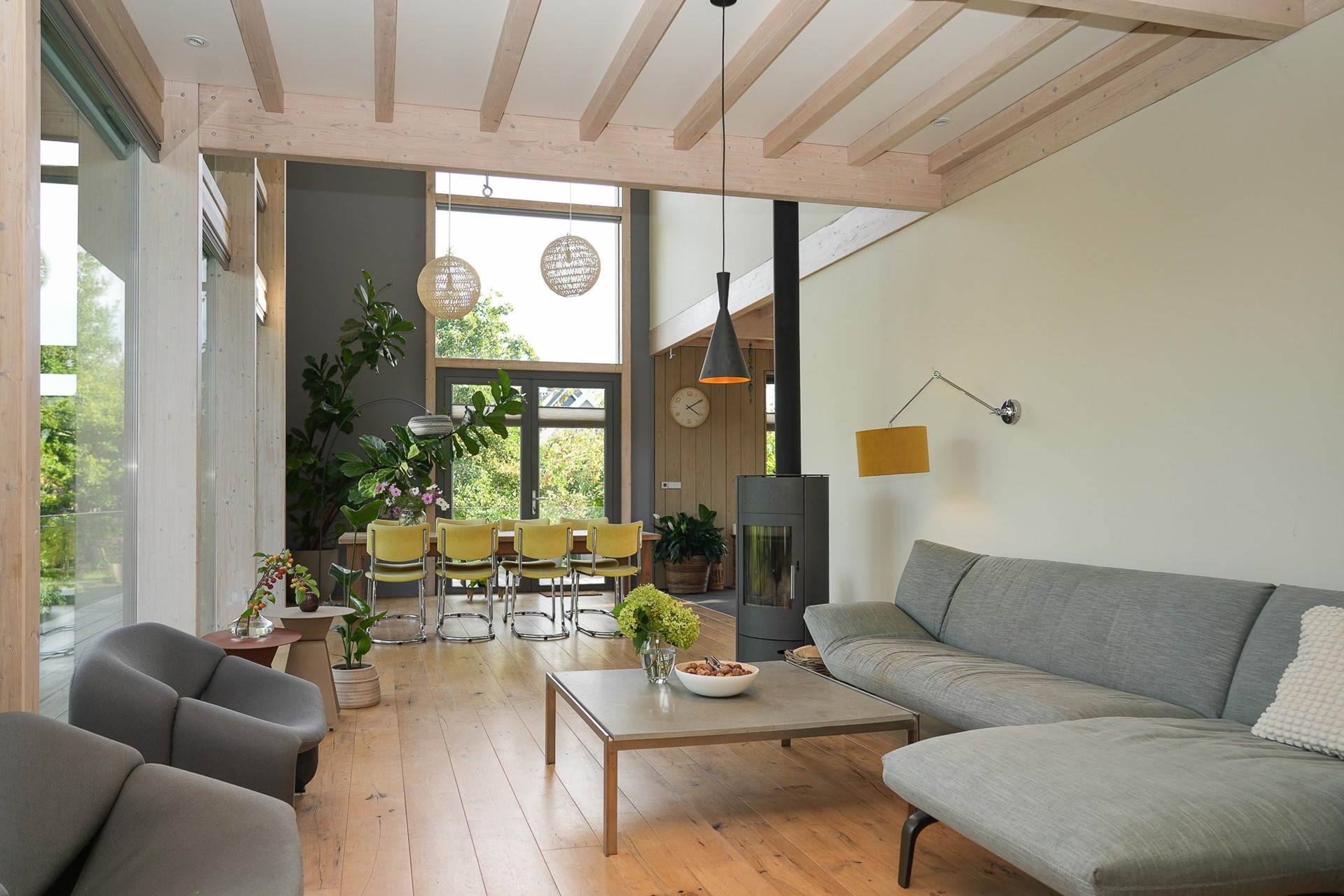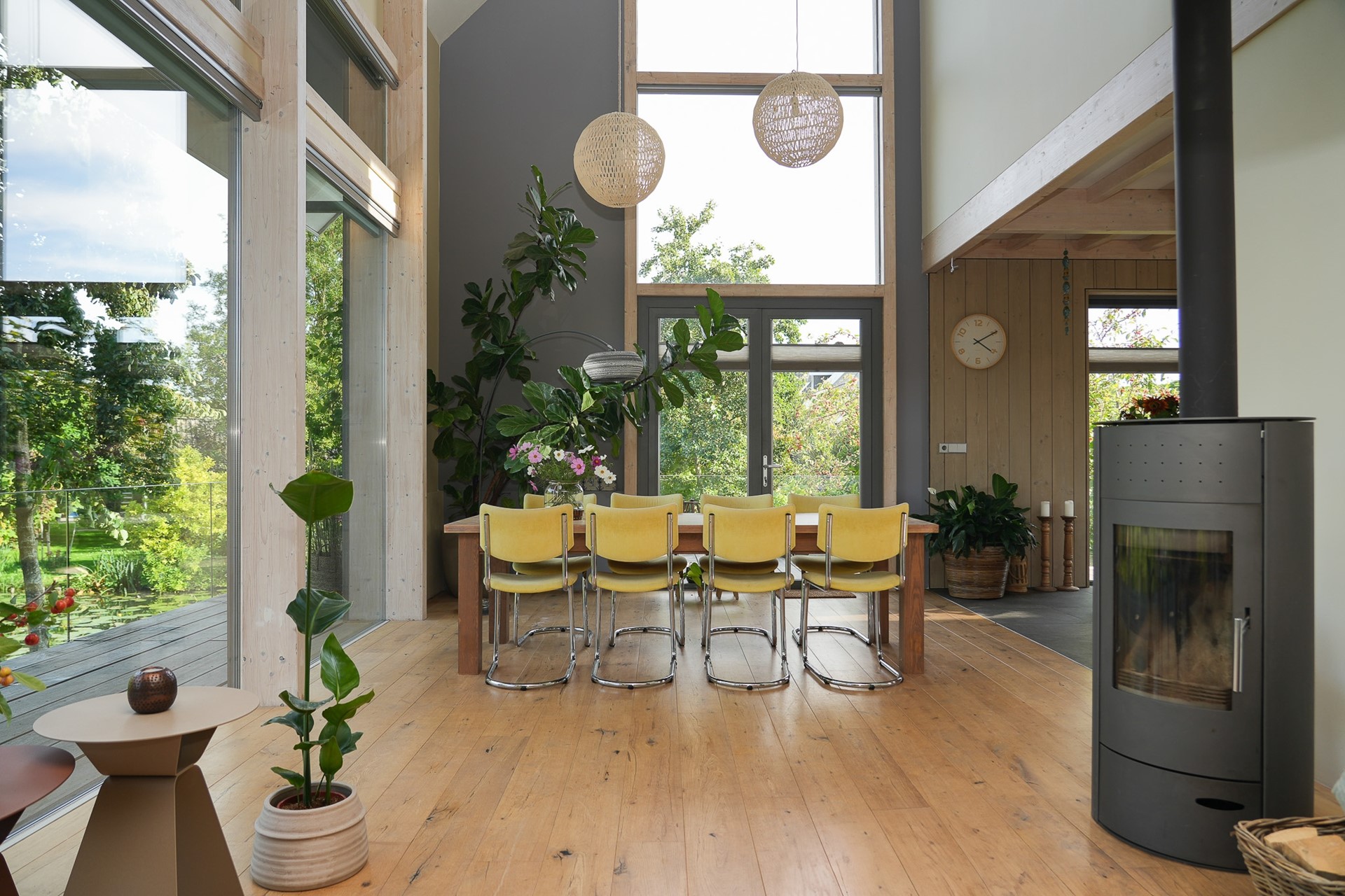 De woonkamer staat in open verbinding met de eethoek en is voorzien van een sfeervolle houtkachel. Ook hier weer: overal zicht op het buitenleven.
