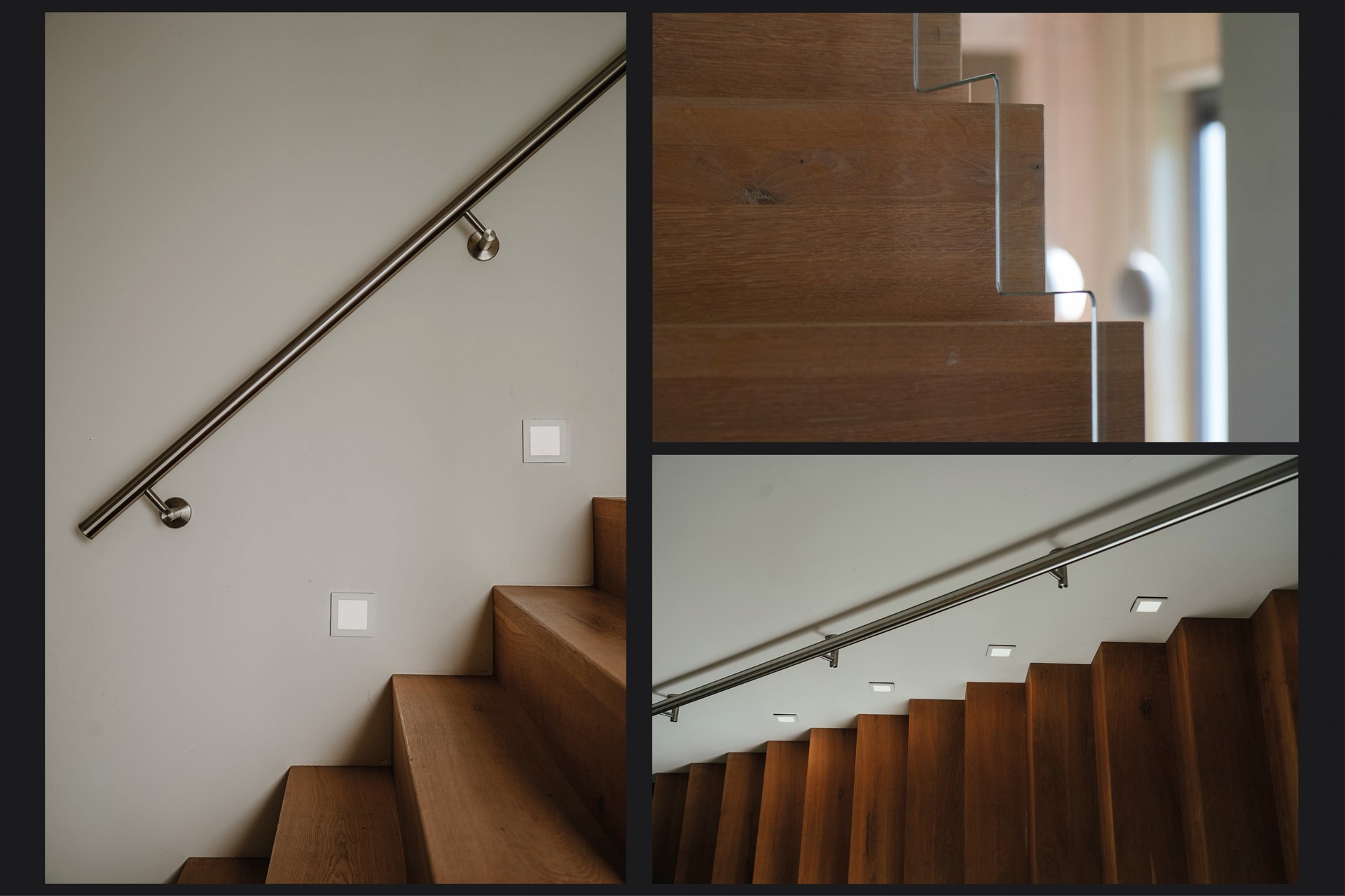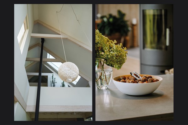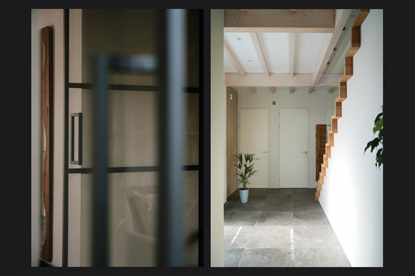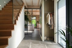 Je komt binnen via een ruime hal met zicht op de op maat gemaakte houten trap. De hal geeft toegang tot de keuken, een werkkamer, een ruime bijkeuken en een badkamer met toilet en inloopdouche. De keuken ligt aan de voorzijde van de woning en valt meteen op door het overvloedige daglicht.