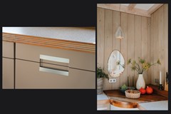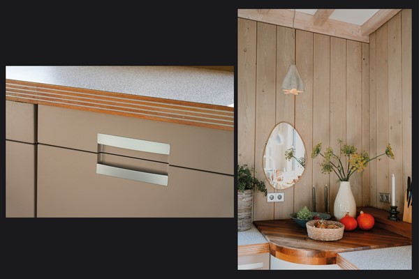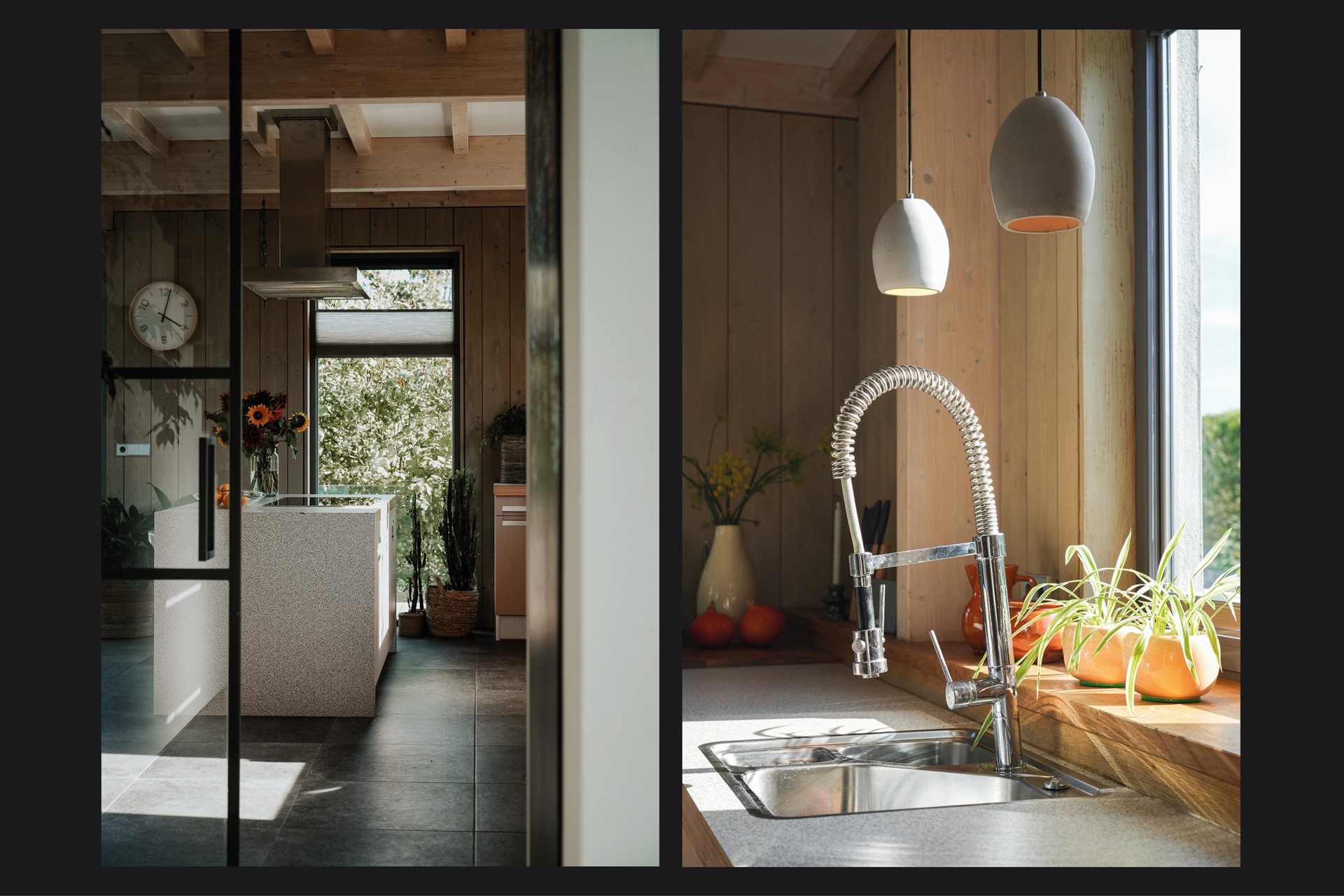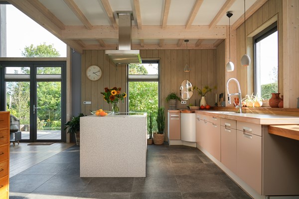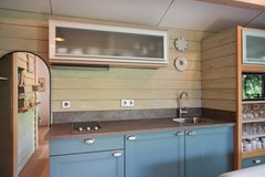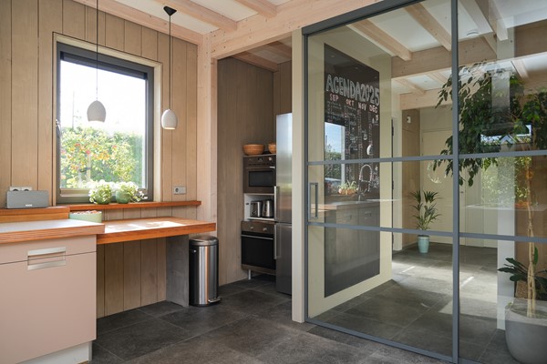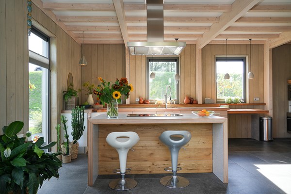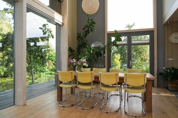 De keuken is functioneel en degelijk uitgevoerd, met een kookeiland met inductieplaat en volop werkruimte langs de wand met een dubbele (1,5) spoelbak. In de hoek staat een los meubel met koel-vriescombinatie, oven en magnetron. Aansluitend vind je de eethoek, waar de hoge glazen pui met openslaande deuren uitkijkt richting de zijkant van de tuin. Aan de achterzijde biedt een glazen wand over de volle breedte een panoramisch uitzicht over het water.