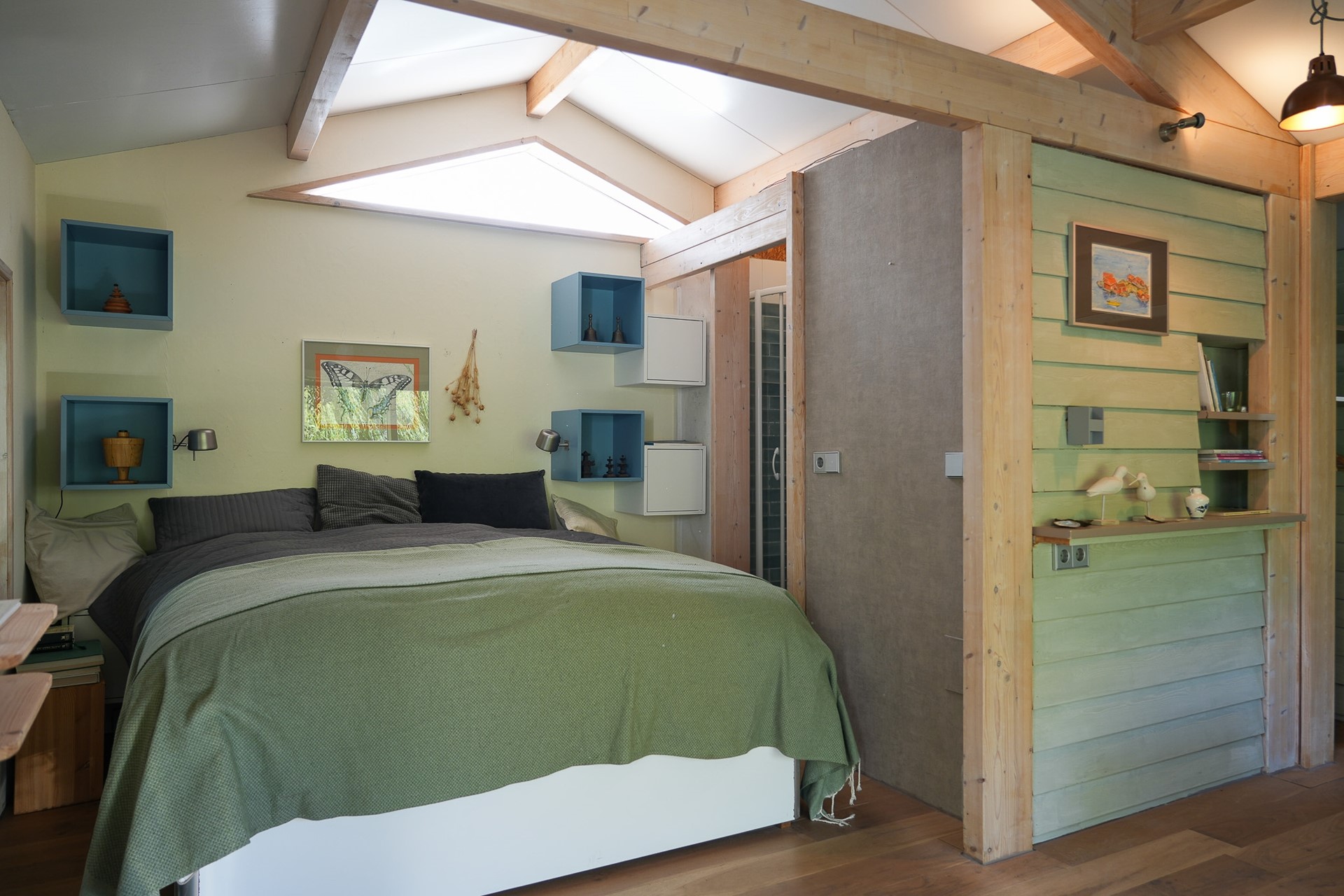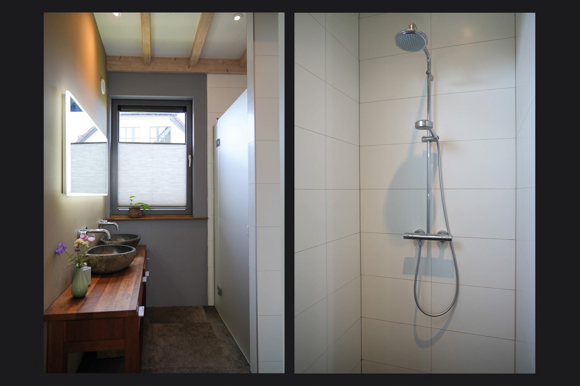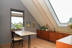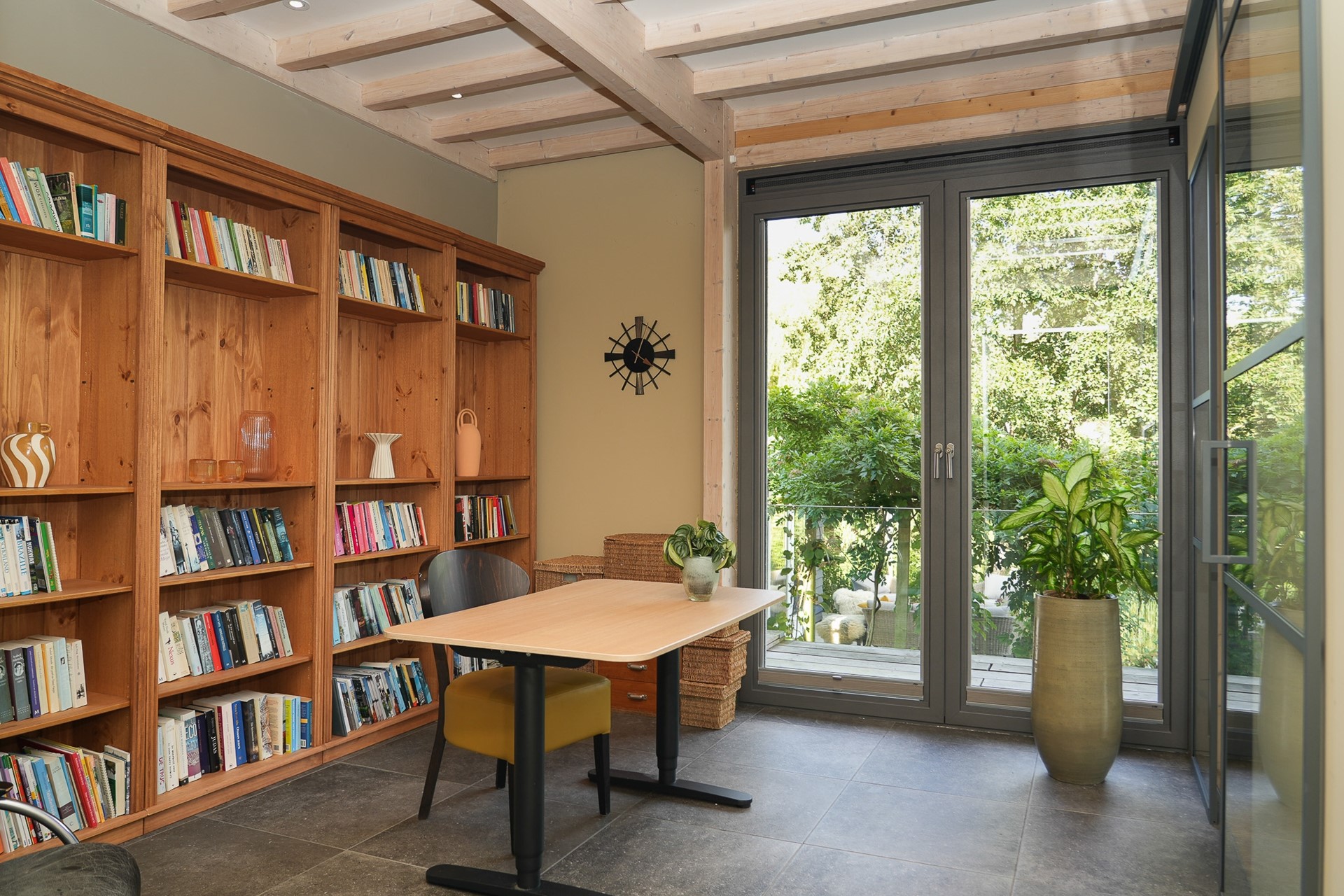 Naast de woonkamer ligt de werkkamer, bereikbaar via een steel-look schuifdeur én vanuit de hal. Deze ruimte heeft draaikiepramen naar de vlonder en ligt naast de ‘badkamer’ met inloopdouche en toilet. Door de indeling is het eenvoudig mogelijk om hier een slaapkamer op de begane grond te realiseren. Levensloopbestendig wonen behoort dus zeker tot de mogelijkheden.