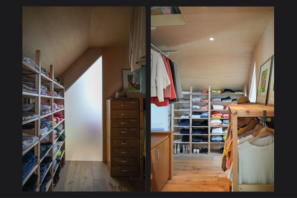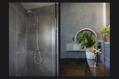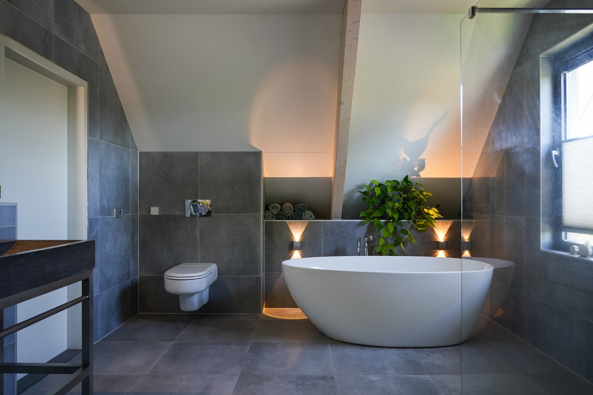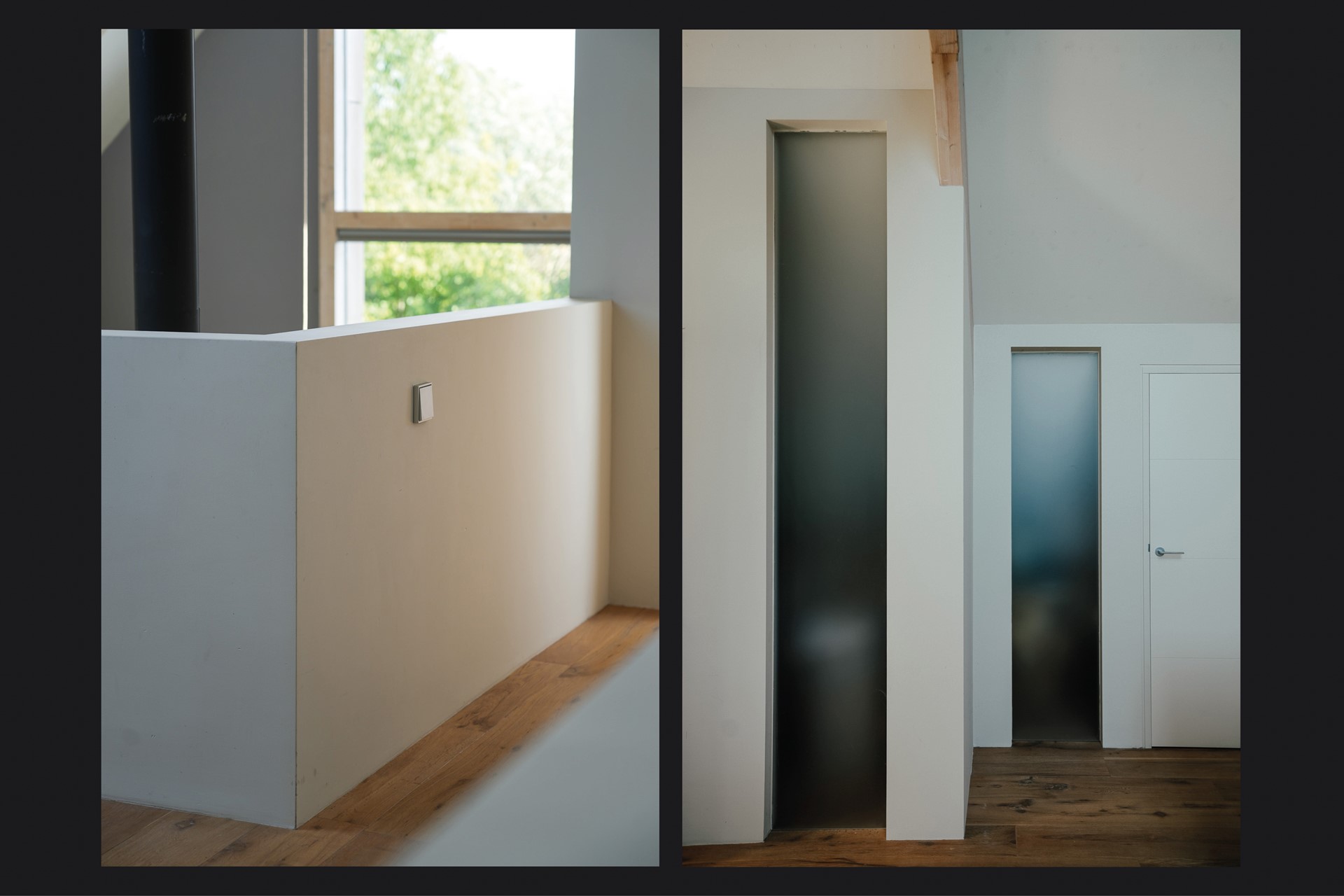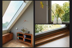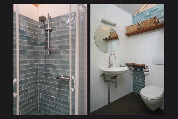 Naast de woonkamer ligt de werkkamer, bereikbaar via een steel-look schuifdeur én vanuit de hal. Deze ruimte heeft draaikiepramen naar de vlonder en ligt naast de ‘badkamer’ met inloopdouche en toilet. Door de indeling is het eenvoudig mogelijk om hier een slaapkamer op de begane grond te realiseren. Levensloopbestendig wonen behoort dus zeker tot de mogelijkheden.